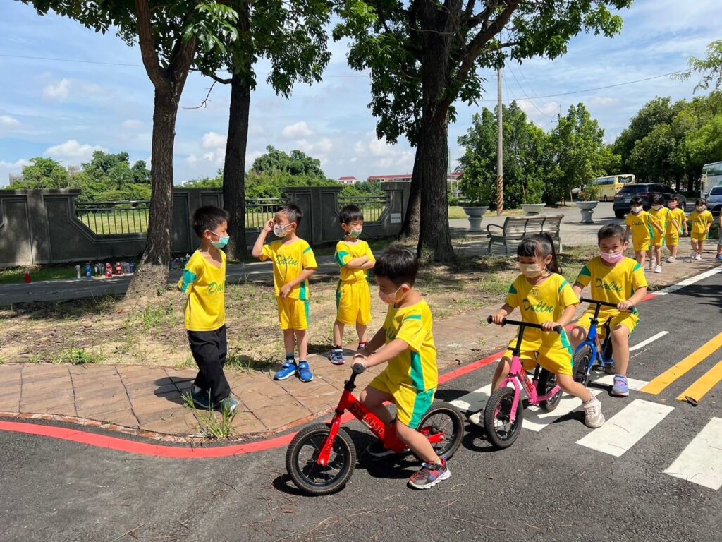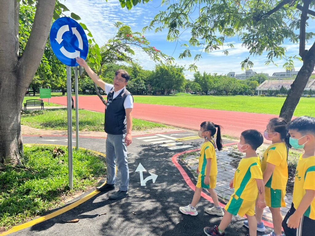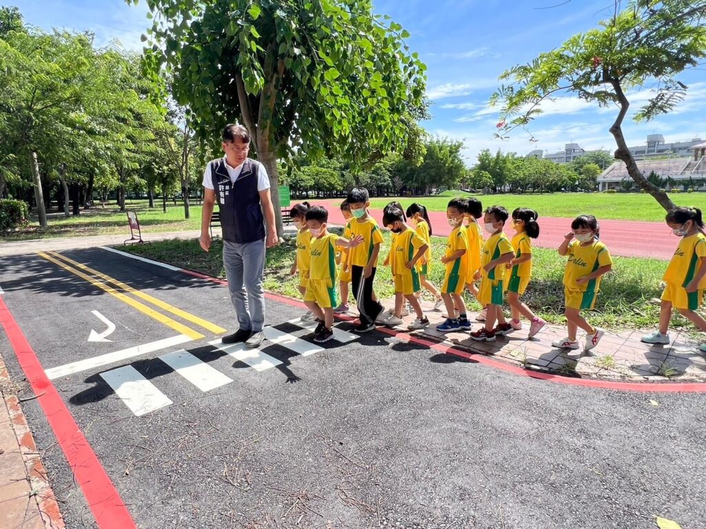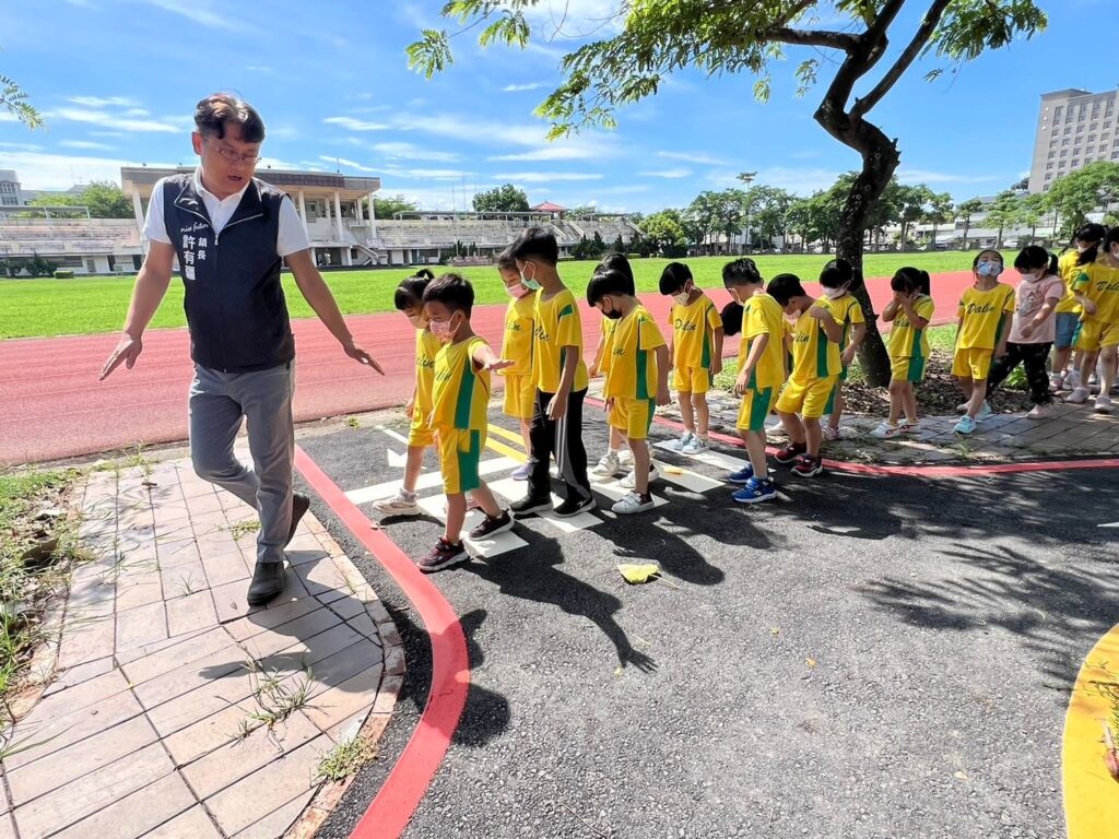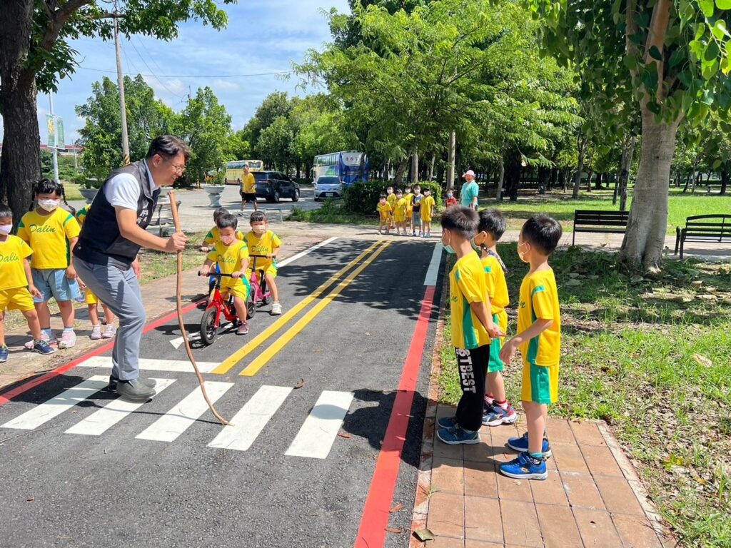 許鎮長表示,有感於交通安全是每個人都應該確切執行的事情,交通安全知識更要從小教育,因此積極爭取在鎮內興建兒童交通公園,經交通部補助200萬元經費,縣府執行工程計畫,大林鎮簡易兒童交通公園從112年10月底開工,今年2月底完工並正式啟用,這是嘉義縣都市公園計畫內最新的兒童交通公園,公園竣工啟用後,每天下午或假日都可以看到家長帶著孩子騎著滑步車或三輪車來到這裡遊玩。今天(6月18日)上午,許鎮長和大林鎮立幼兒園老師帶領28名小朋友至簡易兒童交通運動公園進行戶外教學,孩子們學習騎車轉彎、過馬路、等紅綠燈、過平交道,玩得好開心,有疆鎮長和老師親自在旁看著並細心教導安全規則,鎮長還扮成拿拐杖的老爺爺,教育孩子如何禮讓行人,讓孩子從實際場域中發展多元情境的體驗學習方式。