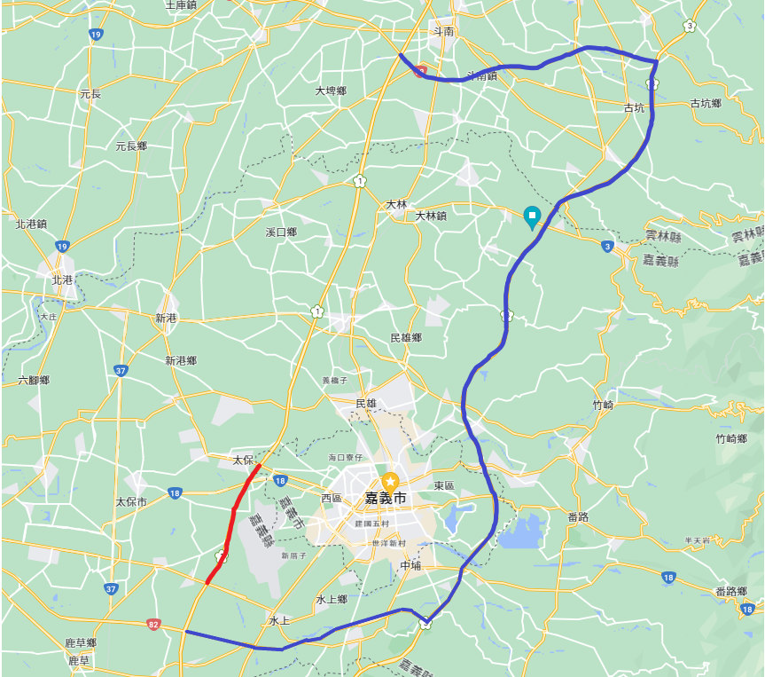 長程:國1 南行→國1 雲林系統交流道→台78 東行至古坑系統交流道→國3 南行至水上系統交流道→台82 西行至嘉義系統交流道→國1 南下方向續行。