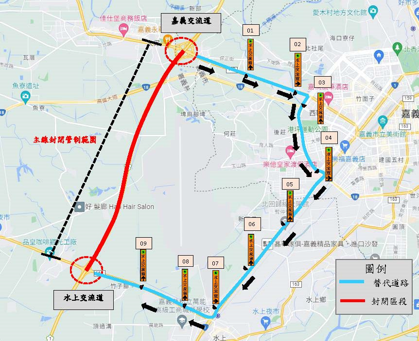 國道1號南向嘉義交流道至水上交流道6月25、26日夜間主線施工封閉,車輛請配合改道行駛