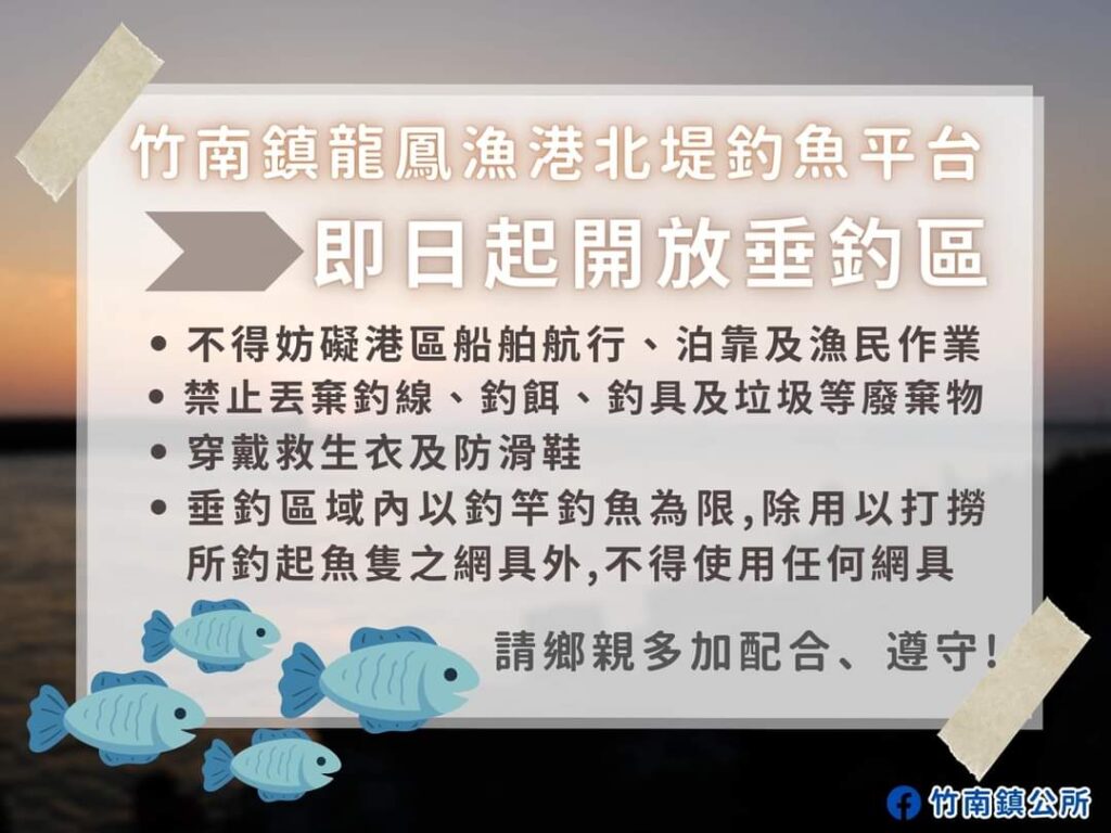根據苗栗縣政府公告竹南鎮龍鳳漁港北堤釣魚平台開放為垂釣區,從即日起正式開放,釣友們可以在全新建置的垂釣平台上享受釣魚樂趣啦!