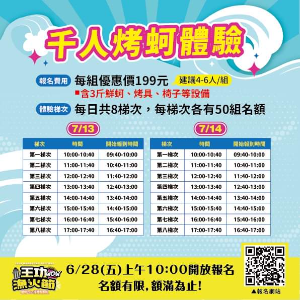 千人烤蚵體驗:每組優惠價199元(含3斤蚵仔、烤具、椅子等設備,建議4至6人一組)