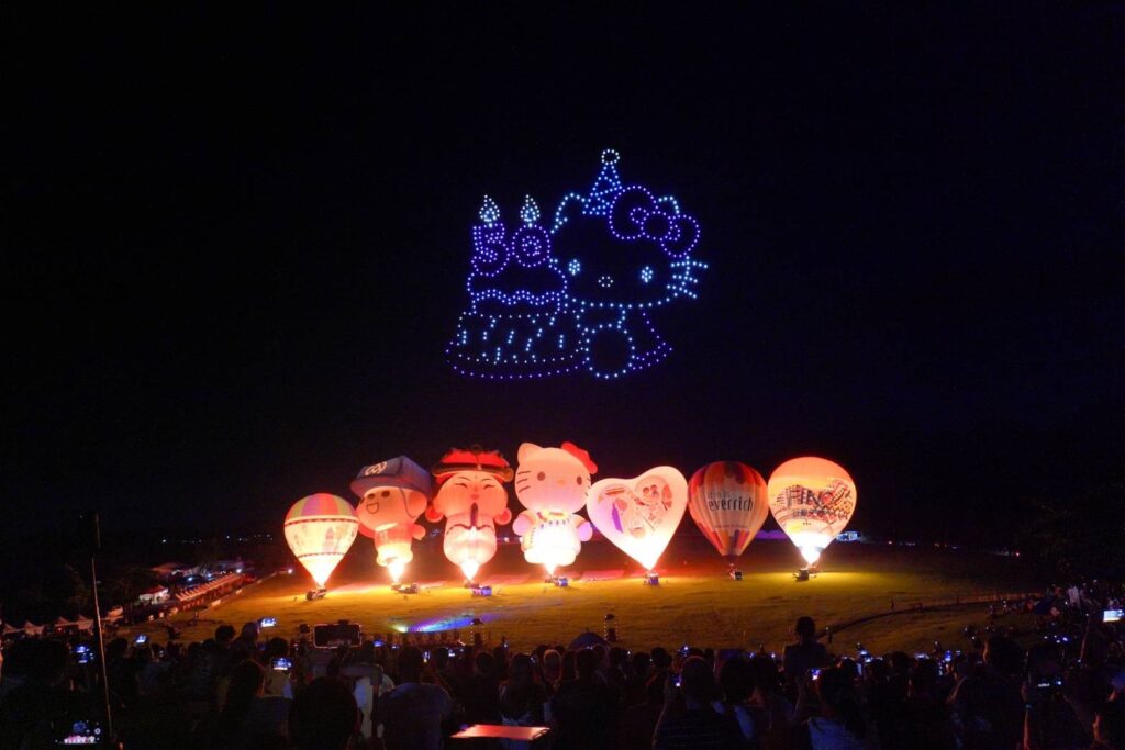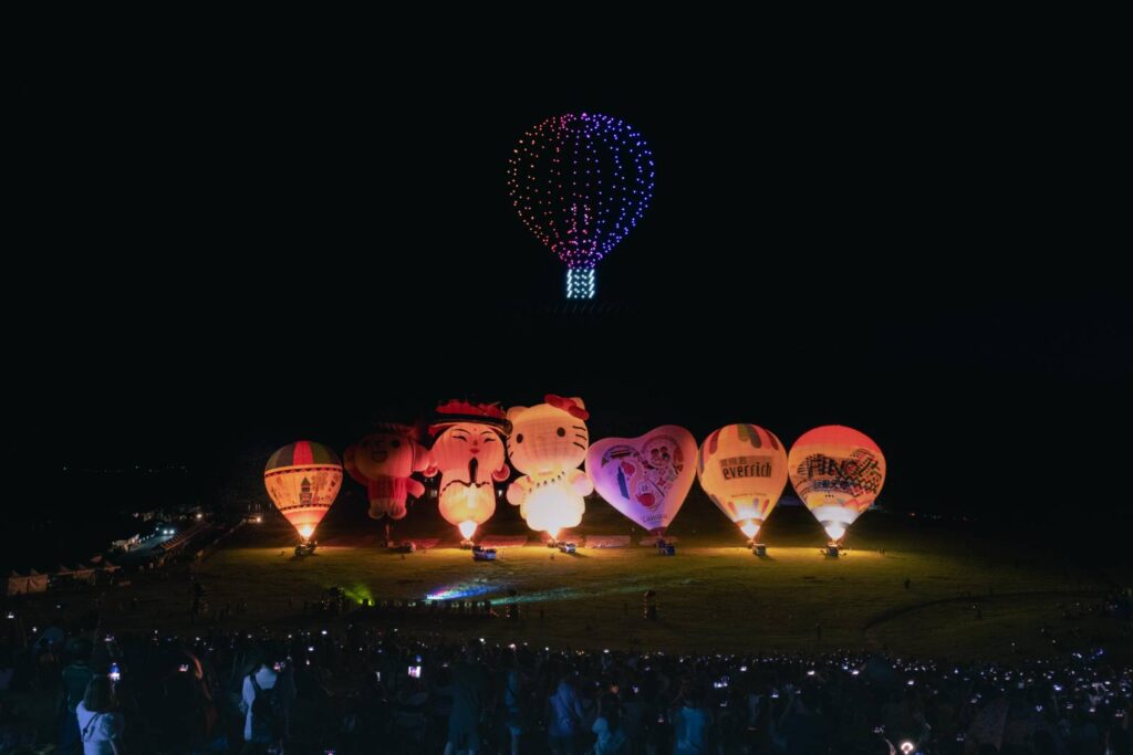 2024臺灣國際熱氣球嘉年華將隆重登場,臺東縣政府昨(7/1)晚首次以「暖身場-熱氣球光雕音樂會」概念辦理,照亮鹿野高台夜空,為今夏東台灣觀光旅遊揭開序幕。活動由高人氣熱氣球明星HELLO KITTY球與臺東天后宮媽祖球帶領熱氣球國家隊(臺東球、愛心球、曙光球、蠟筆球、福利熊球)一同演出,熱氣球光雕結合500架次無人機進行展演,三麗鷗人氣明星加入無人機展演陣容,以及全臺首創無人機QRcode條碼驚喜抽獎,整場演出過程驚嘆聲不斷,現場觀眾直呼超可愛。