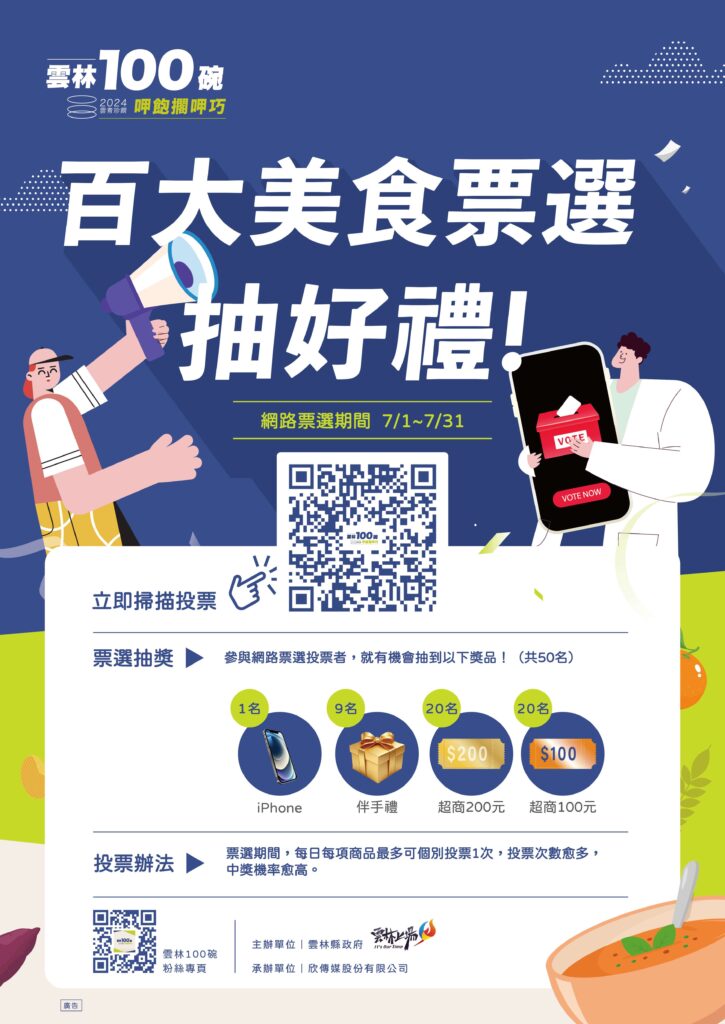 「雲林100碗」網路票選活動於7/1至7/31日進行網路票選、8/12公告票選結果。民眾參與票選「雲林100碗」活動有機會抽中iPhone等大獎,歡迎全國鄉親共同參與,網路搜尋「雲林100碗」來參加。票選網址:https://reurl.cc/70xMo5