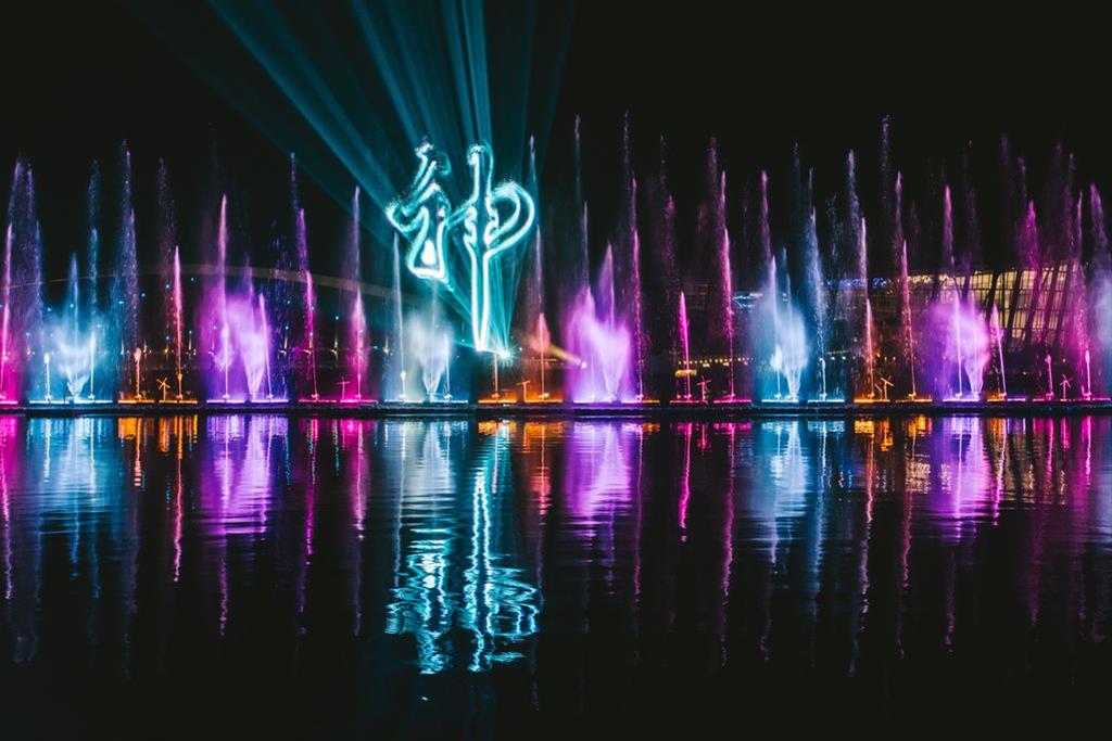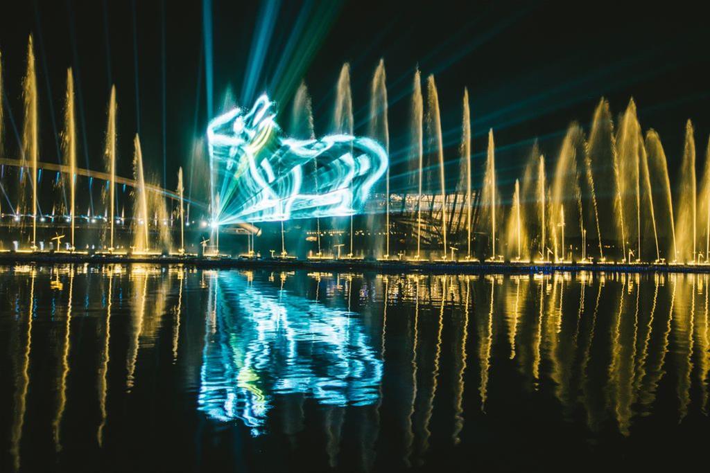 深受觀眾期待的水舞秀今年增強了藝術性,除以名曲「憶想之門」開場,再以傳藝金曲家李哲藝帶領的灣聲樂團獻出「台灣音樂集錦交響詩」收尾,展現氣勢磅礡的氛圍;湖面上2座藝術裝置,像在躲貓貓的「青花紋犧尊」與乘載故宮歷史記憶的3艘童趣紙船,象徵故宮對文化的傳承與對觀眾的祝福。