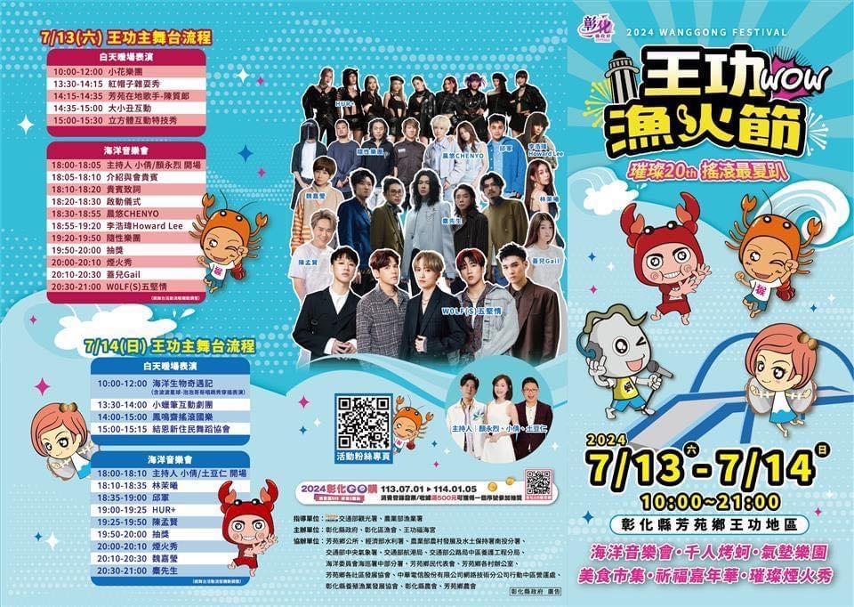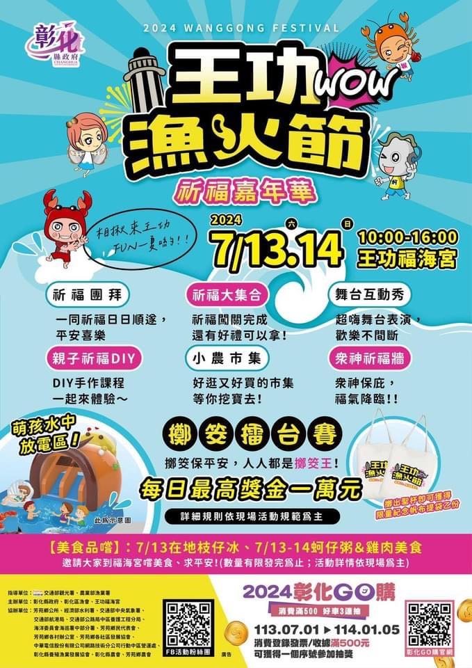 今年活動盛大有三大亮點,包括在王功漁港有水陸氣墊樂園、千人烤蚵、祈福嘉年華、連續二天在晚上8點有7分鐘璀璨煙火秀、無人機及燈光秀、還有壓軸海洋音樂會,將由五堅情、麋先生、魏嘉瑩、陳孟賢等11組樂團歌手接力演出。另外在福海宮連續二天都有擲筊擂台賽,每日最高獎金1萬元。歡迎全國鄉親,7月13、14日相約彰化王功見!