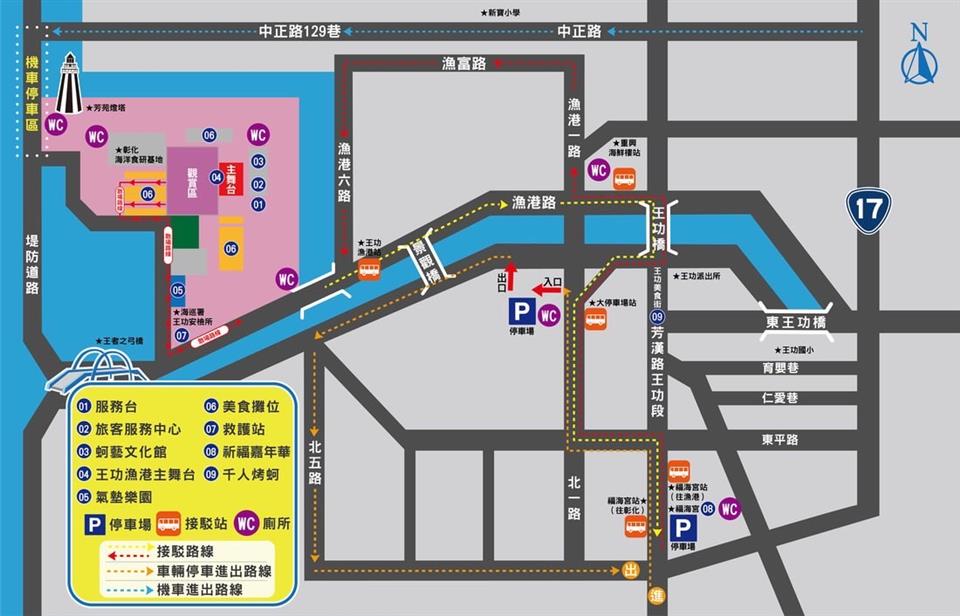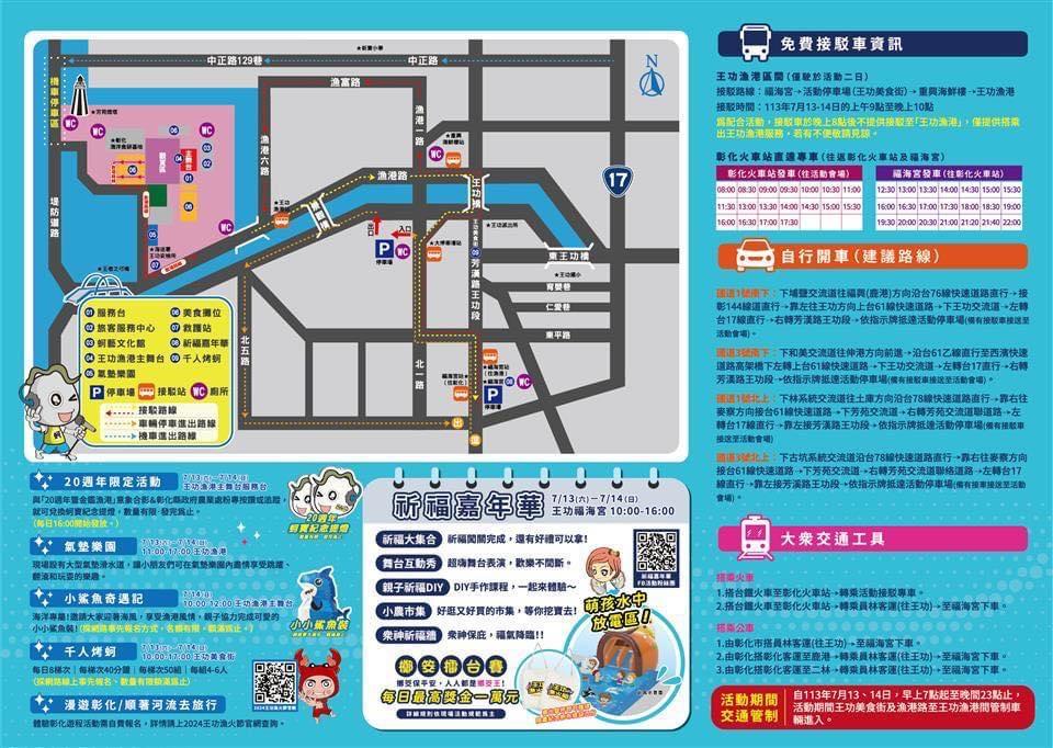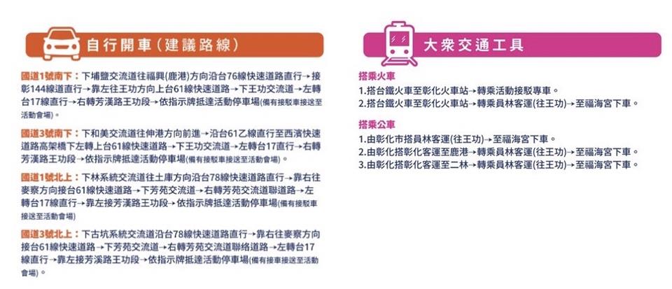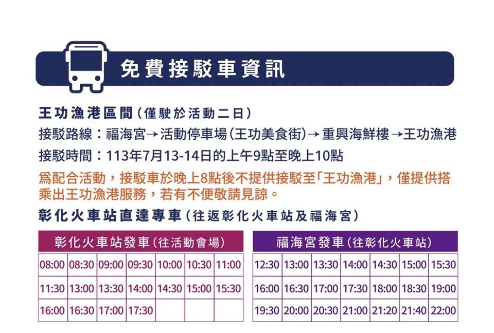 活動期間為有效疏通人潮,每日上午9點至晚上10點在王功漁港至福海宮區間,提供定點免費接駁車服務,另外也規劃彰化火車站往返王功福海宮的直達專車,歡迎民眾多加搭乘利用。