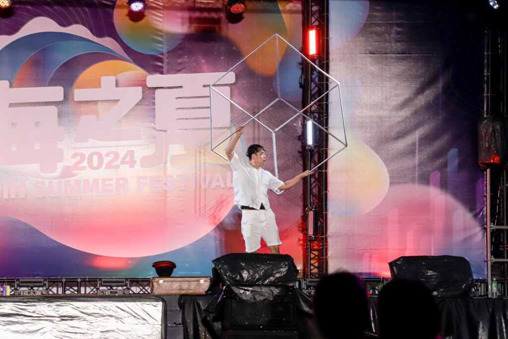 夜間藝術互動表演「馬戲書畫秀」結合馬戲雜耍、扯鈴、親子互動、塗鴉、書法及舞蹈,還邀請觀眾上台一起創作畫畫,讓大小朋友體驗藝術創作樂趣,留下難忘回憶。