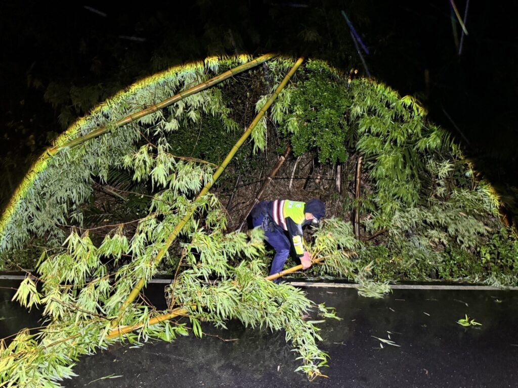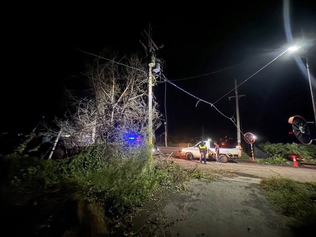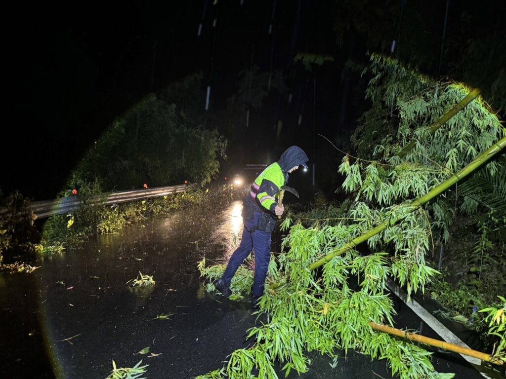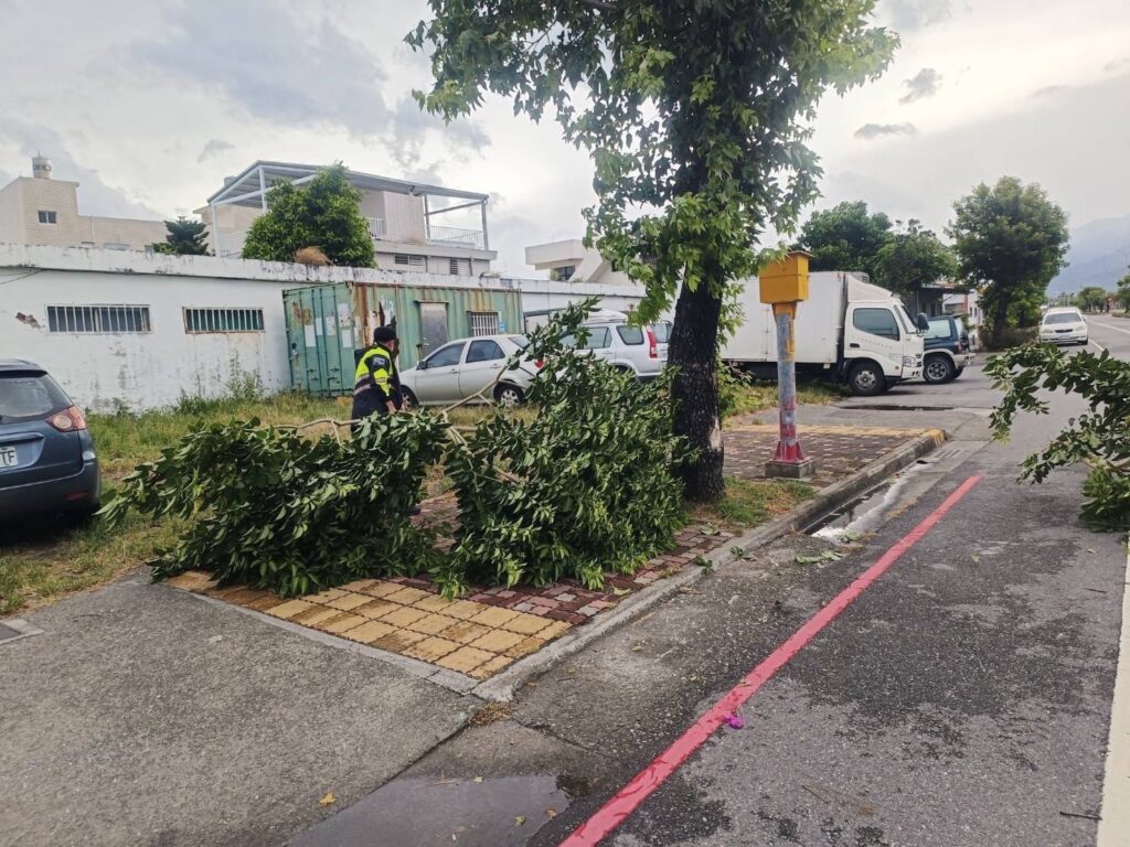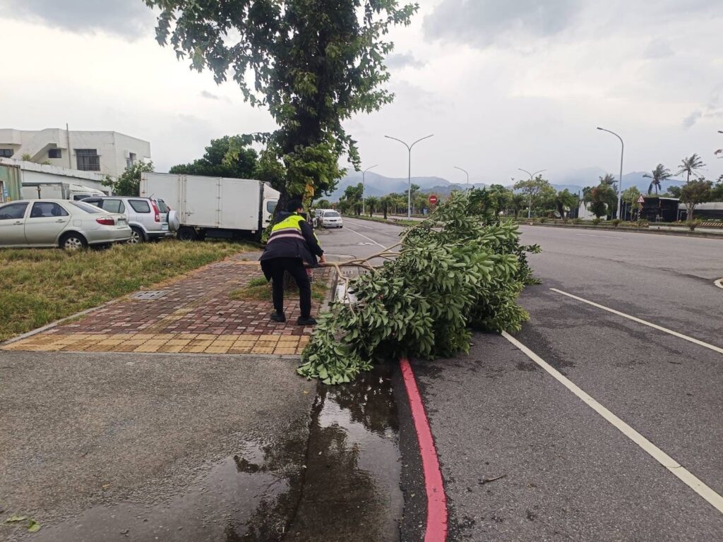 臺東分局於昨(24)日下午起就陸續接獲在臺東市勝利街158巷與馬亨亨大道、卑南鄉東38縣道0.6公里處及太平路170巷等處,發生路樹倒塌、電線掉落危害交通安全情形,各派出所員警都嚴陣以待,馳赴現場管制交通,配合相關單位協力迅速排除障礙,恢復交通順暢,守護民眾平安度過颱風夜。