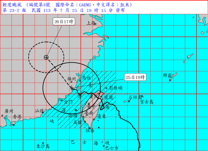 受強颱「凱米」影響,因中央氣象署20:30通報預估雨量已達停班停課標準臨界值350mm,另還有部分地區仍有積淹水善後事宜,為求市民安全及重建家園。高雄市政府根據「天然災害停止上班上課作業辦法」第4條第3款規定,宣布明(26)日全市停止上班、上課。