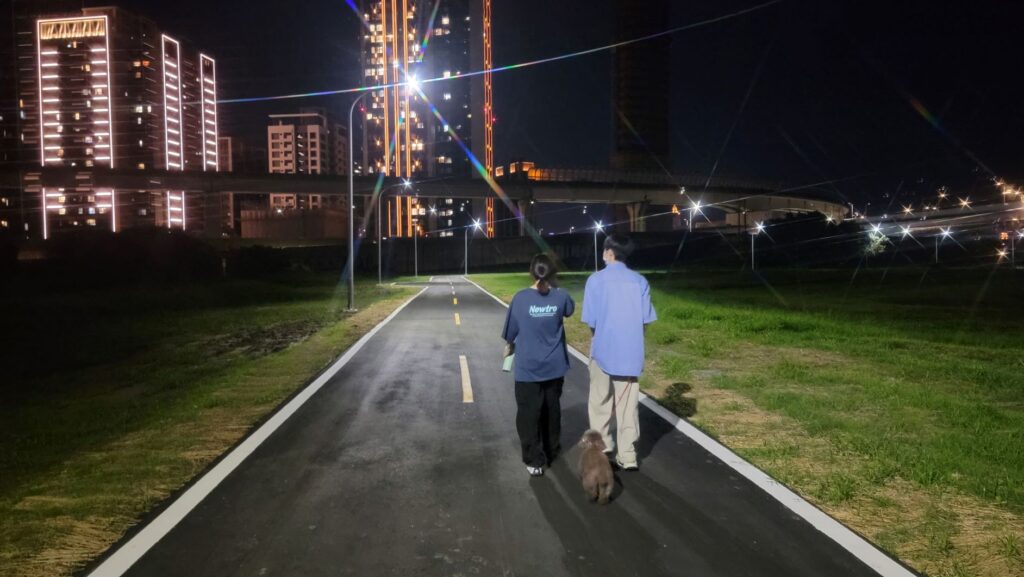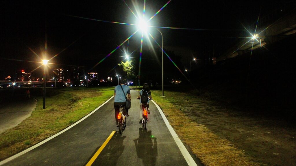 處長張修銘補充說明,除日間自行車騎乘環境,夜間安全亦是重點考量,於改道自行車道旁之綠地,間距每30公尺設置一盞景觀高燈以供夜間照明,使民眾無論白天或夜晚,均能安心享受騎乘自行車之樂趣。