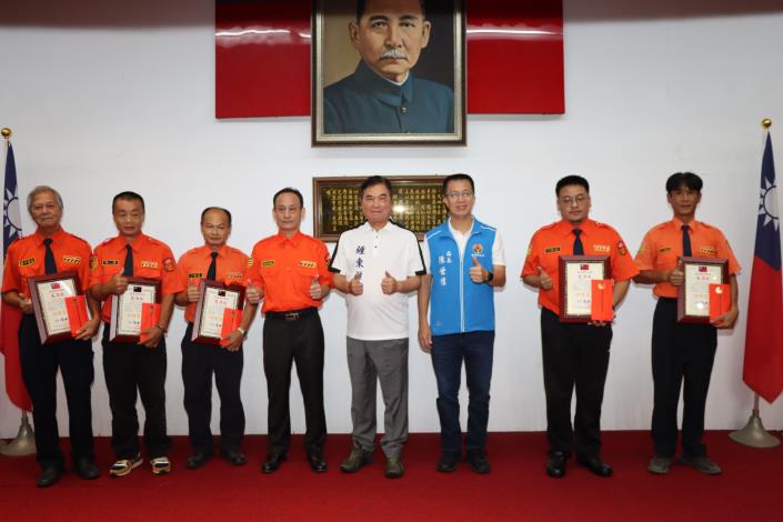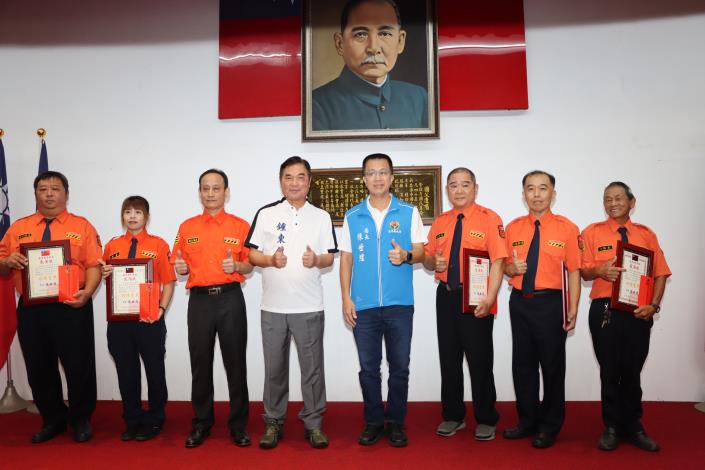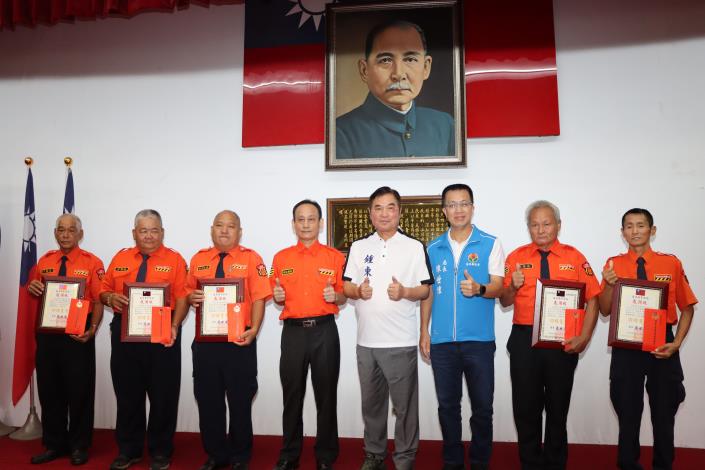 3日苗栗縣長鍾東錦頒獎表揚6位榮退義交及25位績優義交楷模,感謝他們在上、下班時段、重點節慶及各項重大活動中,協助交通指揮疏導;隨後與身為義交大隊長的苗栗市長余文忠共同頒贈運動鞋,提升義交執勤裝備,值勤時更加舒適安全。