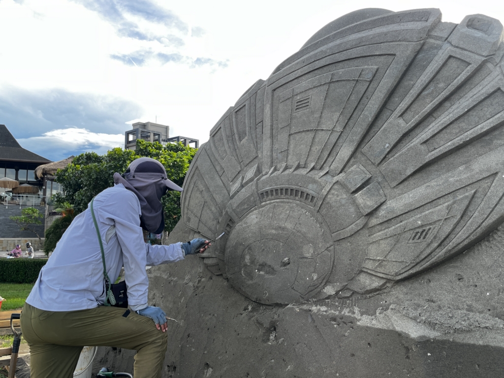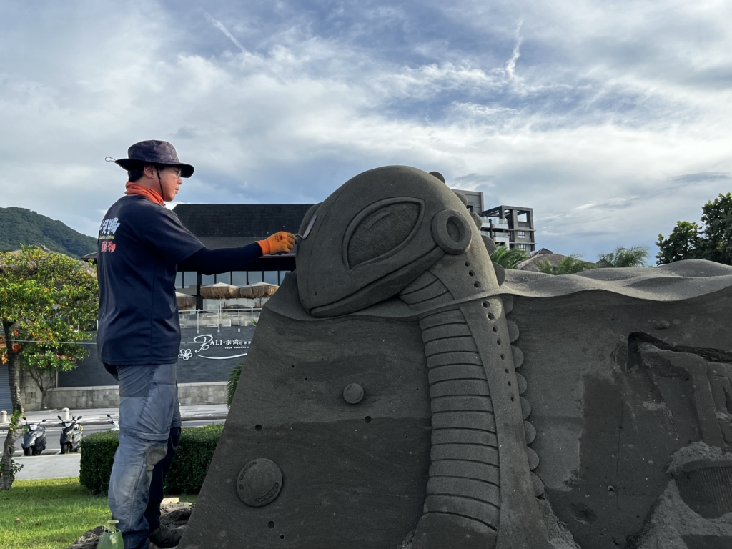 來自日本的沙雕師Mari表示:很開心這次受到邀請來參與八里城市沙雕的創作,創作過程中有看到很多民眾很認真在看製作的過程,讓製作起沙雕來更有動力也更專注!八里的河岸砂質非常適合做沙雕藝術創作,讓製作上可以很放手去用高難度的手法!這次的沙雕以宇宙為主軸,相信會是很多小朋友都喜歡的內容,大家一定要來看。