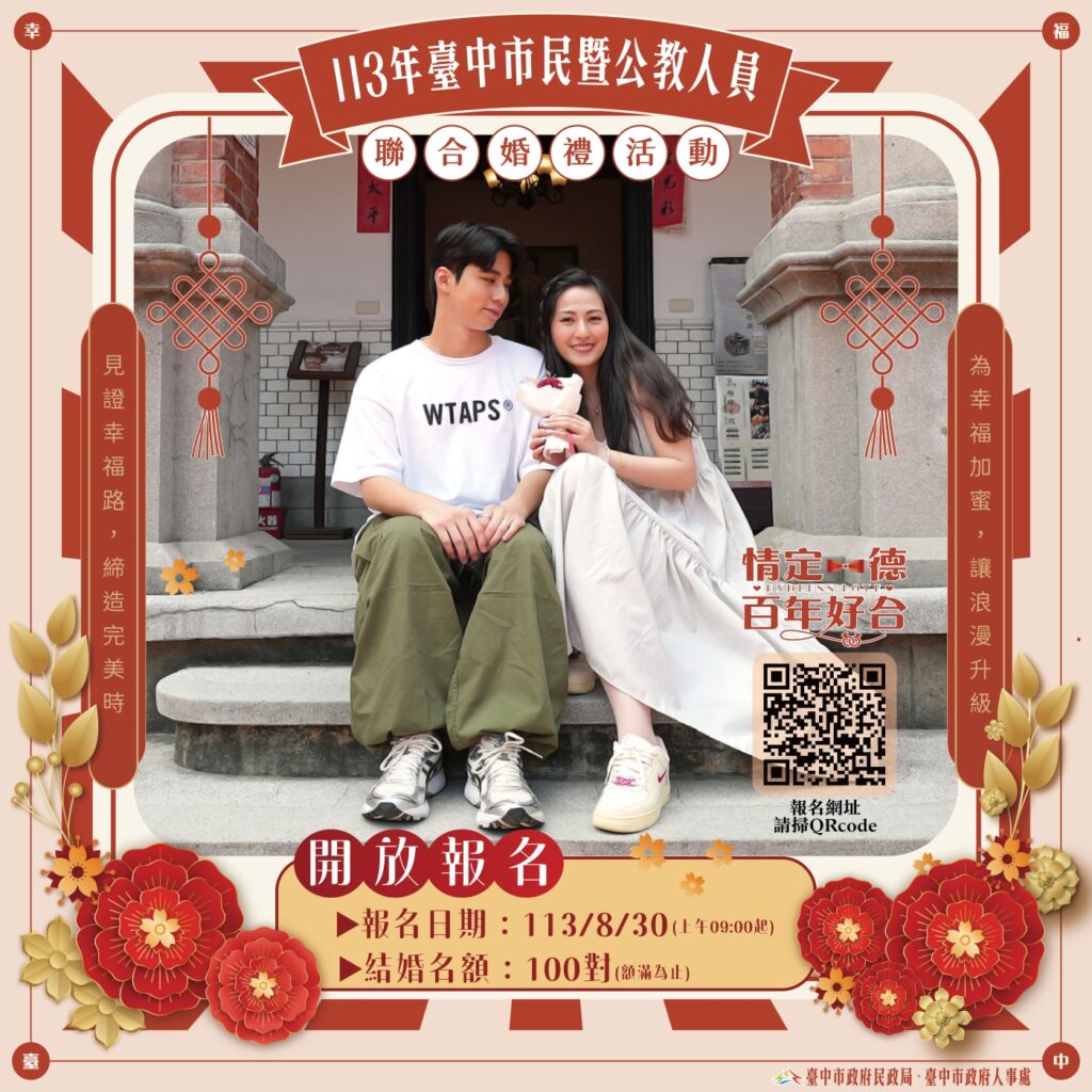 民政局說明,台中市113年聯合婚禮8月30日上午9時開放線上報名,限額100對,新人年滿18歲,其中一方在台中市設籍、就業,或台中市議會及台中市政府所屬公教人員符合報名資格者均可報名參加。此外,市府今年也準備多項幸福賀禮,當天出席聯合婚禮的每對新人將可獲得成家好禮小家電、囍米及囍筷,並有機會抽中鑽戒、蜜月小旅行一晚及珍珠墜飾等多項好禮,報名詳情請至活動專屬網站(https://taichung-wedding-2024.vercel.app/)查詢,名額有限,歡迎新人把握機會報名。