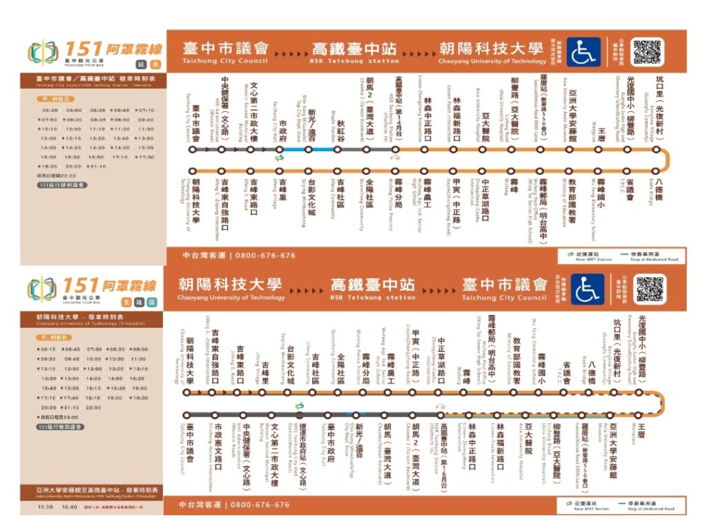 霧峰區民眾到高鐵台中站更方便了!台中市政府交通局與中台灣客運盤點現況151路公車旅運,超過7成旅次為高鐵台中站至霧峰區間,為加強大眾運輸網路,從8月28日起151路公車調整端點為「高鐵台中站-朝陽科技大學」,同時規劃部分班次為「151延」提供原台中市議會往返高鐵台中站區間服務,並維持周休二日、連續假日及寒暑假前一日151區間車「亞洲大學-高鐵台中站」服務,以滿足乘車民眾需求。