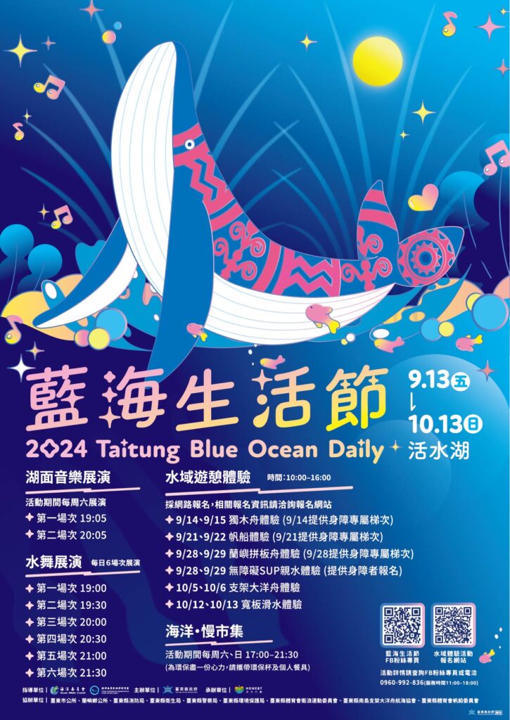 臺東縣政府辦理藍海生活節至今邁入第三年,2023年推出夜間水舞、多項水域遊憩活動廣受大眾好評,今年2024藍海生活節將在9月13日至10月13日重磅回歸,期間天天有水舞、週週有水域體驗,更推出多項無障礙體驗,歡迎身障朋友預約,享受玩水零距離樂趣,體驗台東海洋生活,將活水湖打造成臺東水域新亮點。