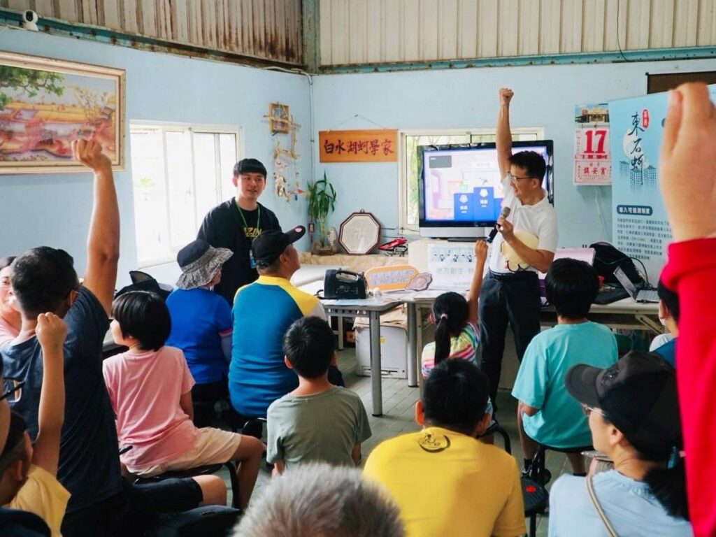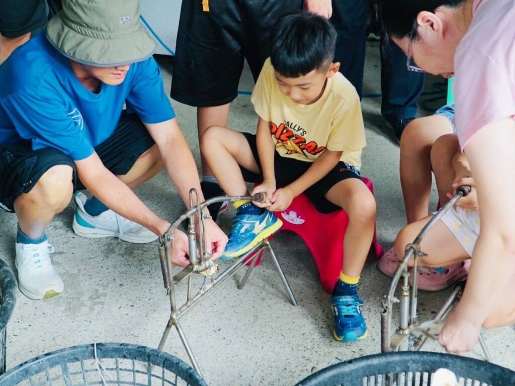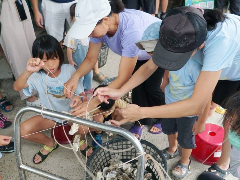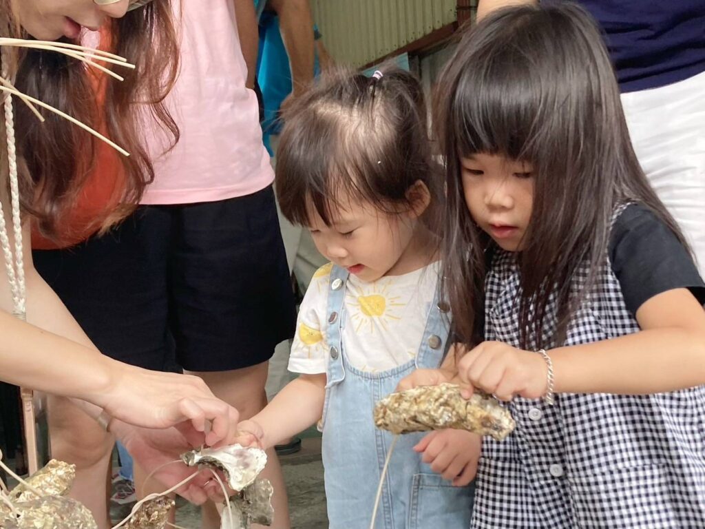 「牡蠣是如何養殖?又是如何在海中生長?」白水湖蚵學家經營者陳長花透過影片帶領民眾認識牡蠣的生活史、蚵農如何養殖及嘉義常見的平掛式、浮筏式養殖方式差異,也藉由漁事體驗包括串蚵、剖蚵及互動遊戲,品嚐嘉義著名烤蚵,讓民眾更認同嘉義在地牡蠣。
