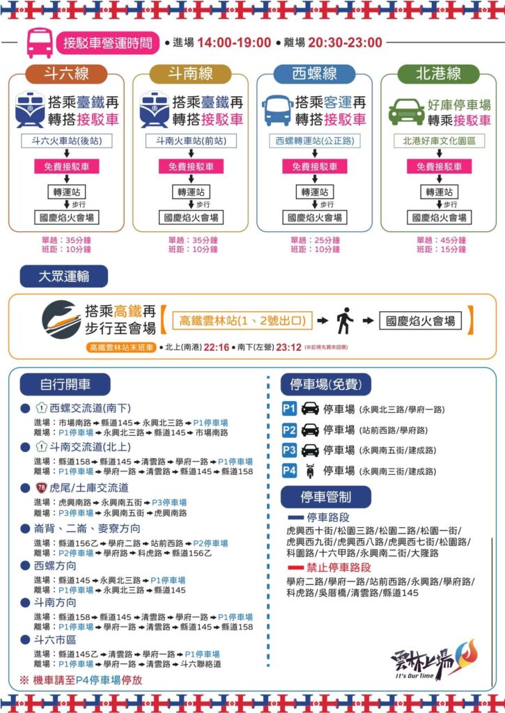 交通工務局長汪令堯表示,本次活動規劃4條接駁路線,全線免費搭乘,乘車點分別為斗六火車站(後站)、斗南火車站(前站)、西螺轉運站及北港好庫文化園區,直達位於會場焰火轉運站。往會場首班接駁車自下午2時起,服務至晚間7時,約每10分鐘一班,人潮坐滿立即開車;返程部分則自夜間8時30分起,服務至全數民眾疏散完畢為止。另於4條接駁路線皆有無障礙車輛提供服務,有需要之乘客可事先預約,聯繫電話0936-609-823