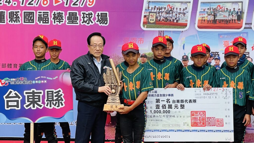 在花蓮舉辦的2024年第十二屆花蓮台彩威力盃全國少棒賽,今(9)日進行冠軍戰,由臺東縣迎戰宿敵桃園市,結果臺東縣二任投手成功壓制對手,終場以2比1擊敗對手,奪下隊史第4冠,也獲得多個個人獎項,並抱回百萬獎金,縣長饒慶鈴請領隊紅葉國小方穎豐校長轉達恭賀小選手及教練團,也希望目標明年學生棒球聯賽與選拔賽繼續加油。