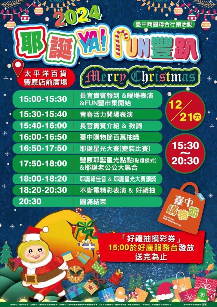隨著2024年耶誕節的腳步臨近,豐原區將迎來一場精彩的節慶盛會!由台中市政府經濟發展局主辦的「耶誕YA FUN豐趴」活動,將於12月21日下午3時30分至晚上8時30分於豐原太平洋百貨前廣場盛大登場。當天除有一系列的耶誕節活動,也將抽出台中購物節百萬現金獎得主、百萬汽車及12組十萬元、1,100組三千元等獎項,經發局呼籲,購物節活動即將進入尾聲,趕緊將消費發票及收據登錄APP,就有機會中大獎!