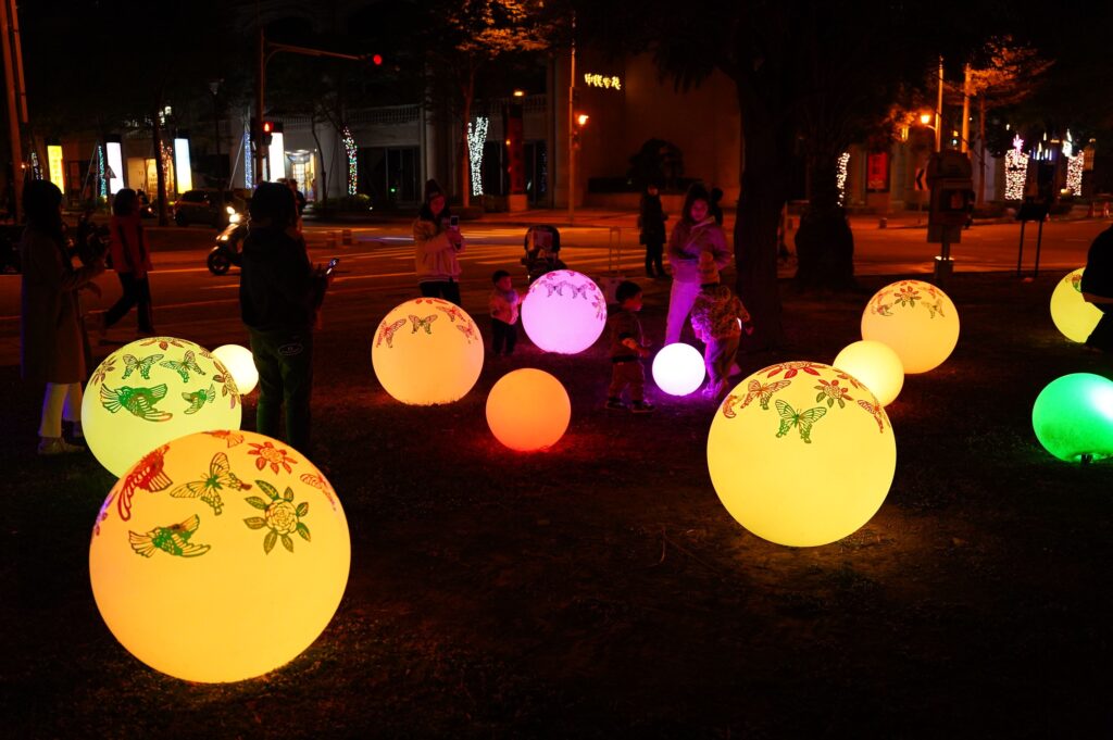 除了新詩創作,這次也特別邀請社會學家兼紙刻藝術家魏少君,與東興圳旁的六家國小及興隆國小二校150位學童進行剪紙共創,作品為象徵新竹縣的五色鳥與茶花,以及台灣特有種寬尾鳳蝶等花草生物,作品黏貼在燈球上,設置草地間,創造出屬於自己的一道風景。