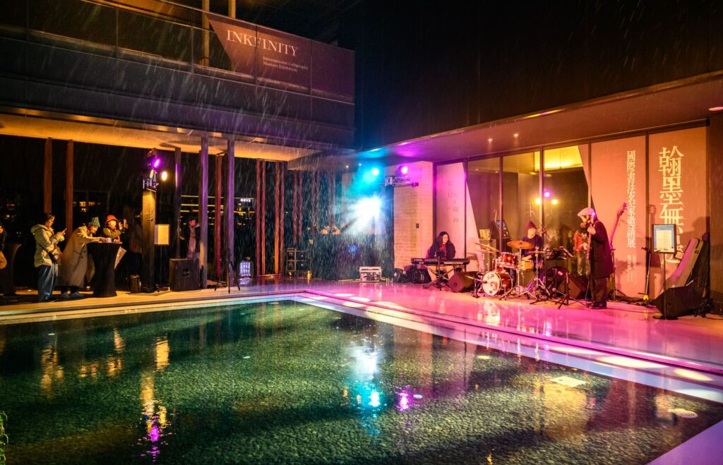 本區由太極影音團隊製作,將投影光影映照書藝館建築和水池倒影,以戶外投影劇場方式與館內「翰墨無邊─國際書法名家邀請展」展覽相互回應。「經典書法:曲水流觴」的概念來自王羲之〈蘭亭集序〉中,參與聚會的文人雅士拿取漂浮在流水上的酒杯喝酒作詩的場景。本作〈翰墨無邊〉透過館內展出作品,重現溪水流動般的書法筆勢韻律,讓觀者聚會於夜色中感受書法筆墨的流動之美和古典詩意,再現「曲水流觴」的意象,交織出展覽內外空間的書藝對話。