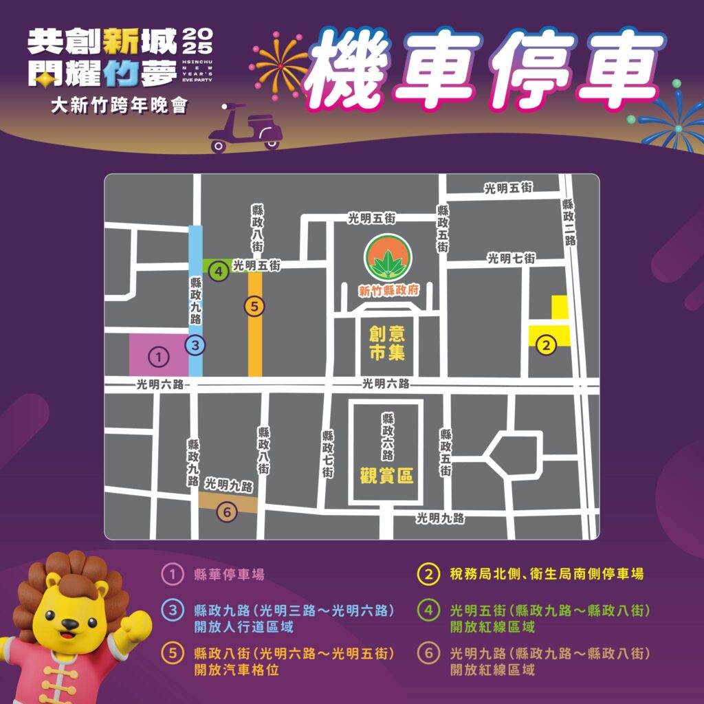 「2025大新竹跨年晚會」將於12月31日下午6時在新竹縣政府前廣場及縣政六路盛大登場,因縣政六路搭建舞台、府前廣場設置市集攤位,縣府周遭將分階段交通管制,31日當天為上班日,縣府特別懇請民眾配合交管,造成不便,請多見諒,同時呼籲民眾盡量利用接駁車進出會場!