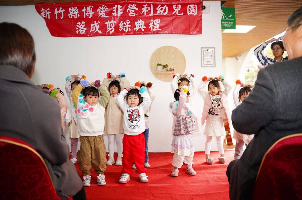 落成典禮由博愛非營利幼兒園的幼兒以動感活潑的舞蹈揭幕,獻上最高謝意,在老師帶領下,幼兒的活力吸引全場目光,感謝教育部國教署經費挹注,以及縣府、博愛國小、曹登貴建築師及弘騏營造有限公司齊心協力,經營法人明新科技大學則乘載各界祝福,攜手努力為幼兒打造安心及健康成長環境。