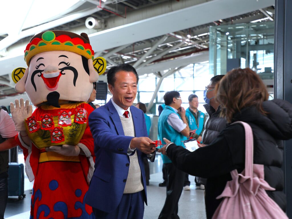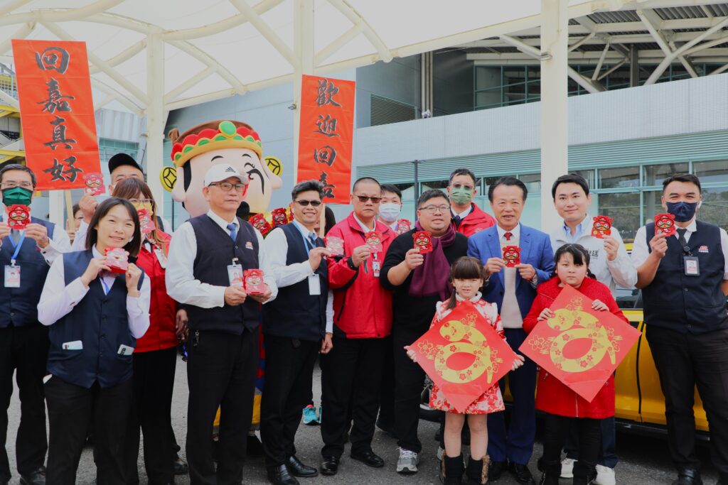 乘客們還沒出站就聽到喜慶的年節音樂迎接他們返鄉,不少民眾拿到紅包後開心地與縣長合照,現場氣氛熱鬧不已。