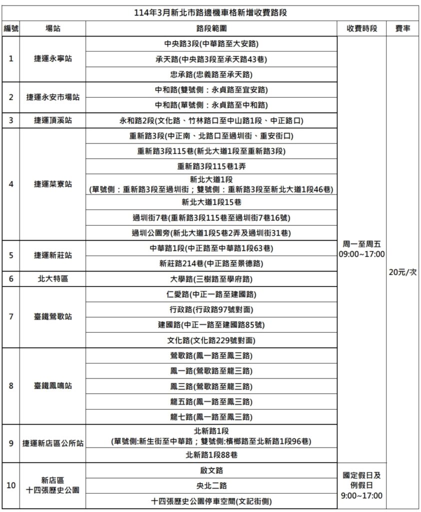 為紓解機車族停車需求及公平共享,新北市交通局將自3月1日起新增土城區捷運永寧站、中和區捷運永安市場站、永和區捷運頂溪站、三重區捷運菜寮站、新莊區捷運新莊站、新店區捷運新店區公所站、鶯歌區鶯歌和鳳鳴火車站等8處大眾運輸場站周邊及三峽區大學路的路邊機車格(詳見下方附表)採計次收費管理,每次20元。
