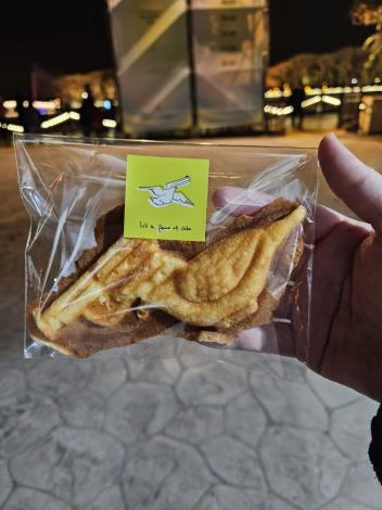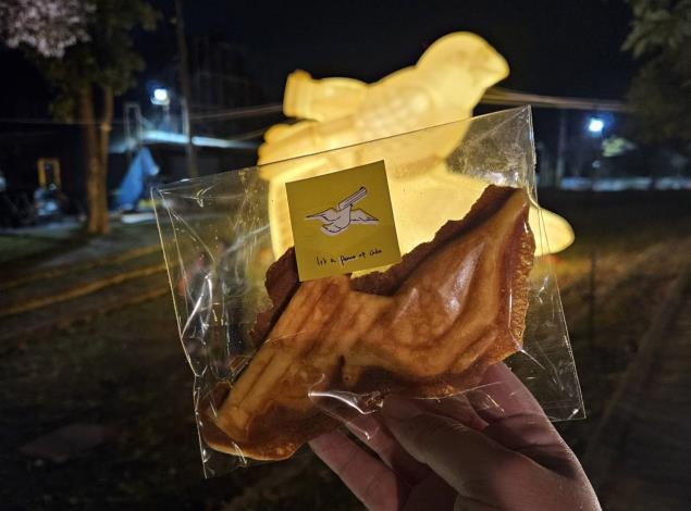 雞蛋糕模具由胡宮雪娜所設計,委託新營在地咖啡廳製作,民眾只要拍照打卡,標記波光節粉專,分享最愛的燈節作品,即可前往服務台免費兌換「IT’S A PEACE OF雞蛋糕」。藝術家把夜市美食成為符號象徵,將藝術與味覺展開對話,讓大家親身體驗胡宮雪娜對於雞蛋糕的衝擊感受,在巨型可愛的氣球下,手拿雞蛋糕與作品合照後吃掉,是一種視覺與味覺的奇幻體驗!