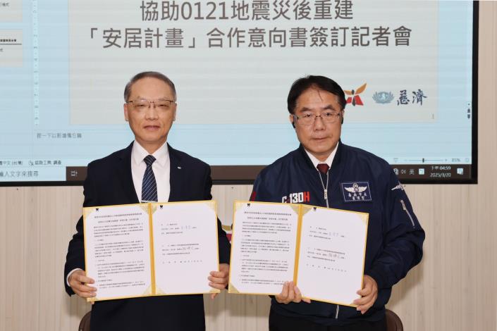 「0121楠西地震」重創臺南,為協助災民家園重建,南市府與佛教慈濟慈善事業基金會於今(20)日下午共同簽定「安居計畫」合作意向書,由市長黃偉哲與基金會執行長顏博文代表簽署,雙方攜手為災區復原與重建,促成兼具災民中繼安置及社會慈善功能之「慈濟大愛屋」,協助災民早日回歸正常生活。