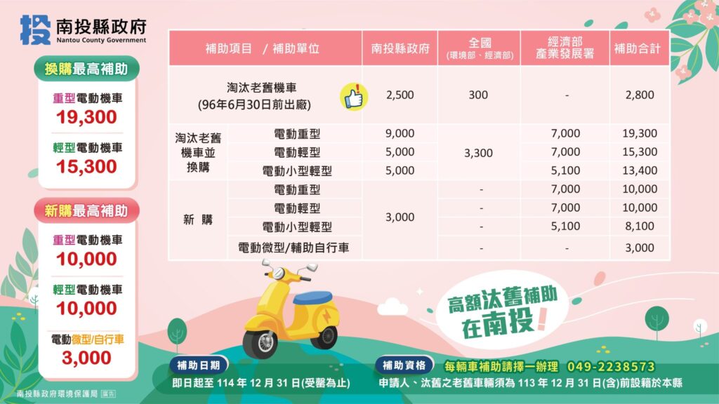 南投加碼鼓勵汰舊換新電動機車 最高補助19300元