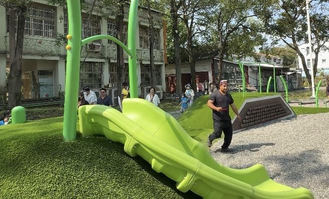 黃偉哲表示,總爺藝文中心以古蹟建築、地景藝術及工藝美學為主軸,擁有大面積的綠地與植栽林蔭,一直是親子遊憩的熱門景點。在規劃遊戲場時,特別考量周邊環境與人文特色,並與藝文中心的資源相互結合,讓遊戲場不僅是孩子們的歡樂天地,更是一處能感受地方文化的場域。
