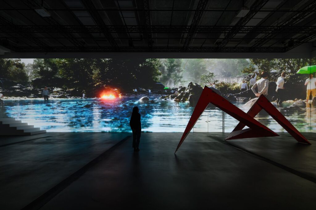 「再自然不過的事」由藝術郭奕臣、辛綺、徐世賢、劉致宏共同打造,展覽呼應「全民美術館」定位,以自然地貌與人造環境更迭為發想概念,像是由螢光沙包堆疊出壯闊的山河地景,淡水河流域空拍衛星圖上構築迷你立體建物,透過藝術家現地創作的形式,邀請民眾一同集體共創大型空間藝術裝置。