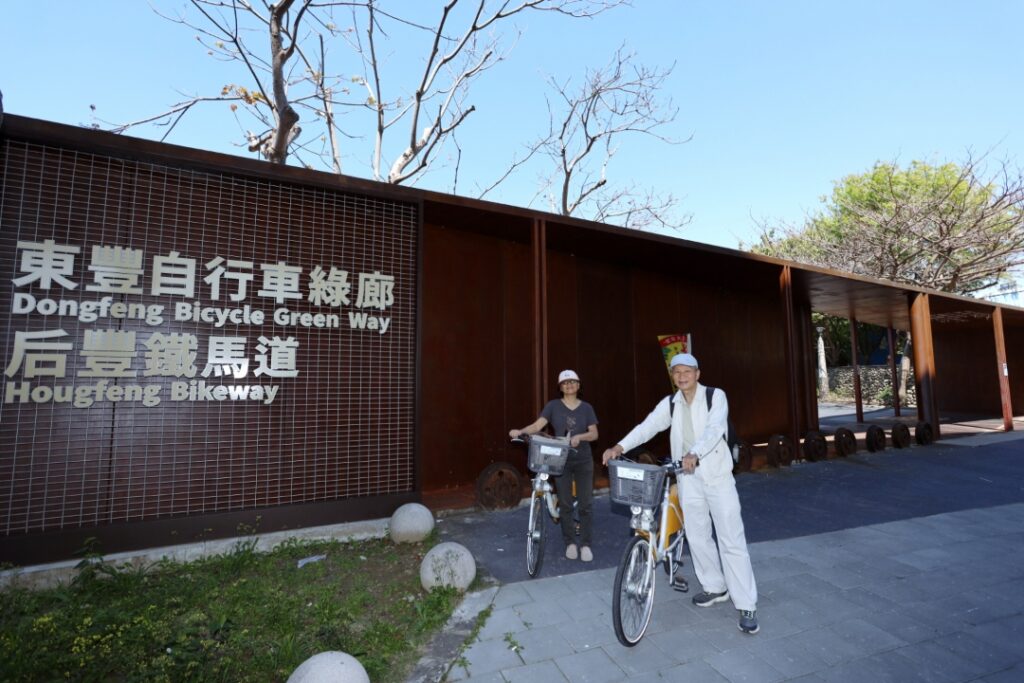 陳局長進一步表示,此次還增設了綠帶並提供休憩空間及座椅,為民眾及遊客創造更安全及舒適的環境。同時,入口處新設置「東豐自行車綠廊」及「后豐鐵馬道」全新拍照打卡牆面,讓遊客從國道四號前往自行車道方可更明確的看到入口,有效提升自明性;背面設有「繼續旅程請迴轉」的指示標語,以提醒民眾及遊客,此處為雙線共用起點,可迴轉後繼續騎乘。