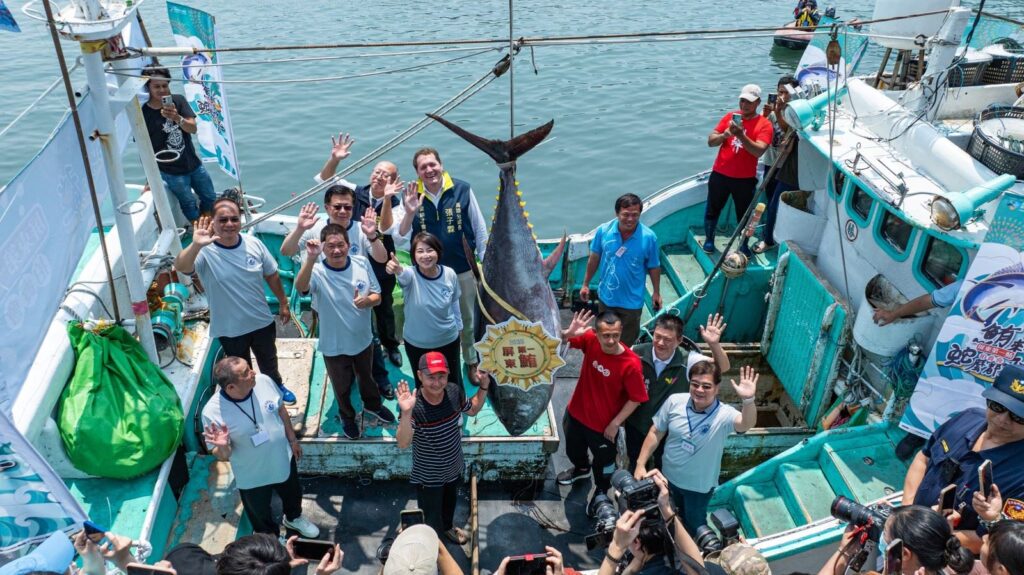 周縣長恭喜陳船長捕獲屏東第一鮪。東港籍的「茂豐祥號」漁船船長陳睿豪討海資歷7年,2年前繼承父業升上船長,恰好在他32歲生日當天捕獲屏東第一鮪,成為有史以來最年輕的第一鮪船長。陳船長表示感謝,希望後續捕獲黑鮪魚的漁民都可以賣到很好的價格。
