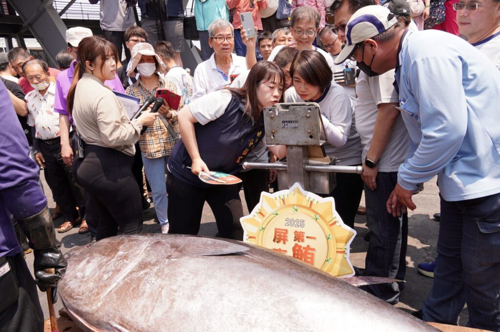 今天上午在鞭炮隆隆聲響中,海巡署巡防艇引導第一鮪漁船「茂豐祥號」入港,縣長周春米、農業部政務次長黃昭欽、漁業署副署長林頂榮、海巡署南部分署副分署長陳朝陽、美國在台協會(AIT)高雄分處處長張子霖、日本台灣交流協會高雄事務所所長奧正史、屏東縣議會前議長林清都等人共襄盛舉,周縣長並登船為今年屏東第一鮪加冕掛牌,經公開秤重,宣布第一鮪身長219公分、重達224.6公斤。