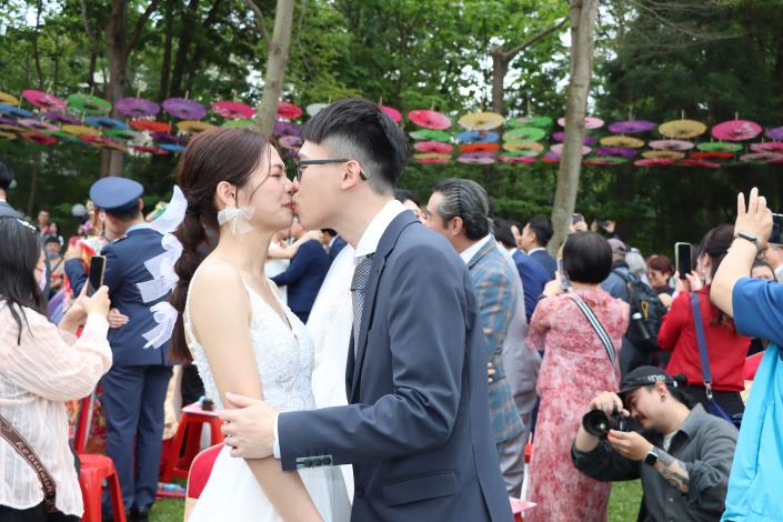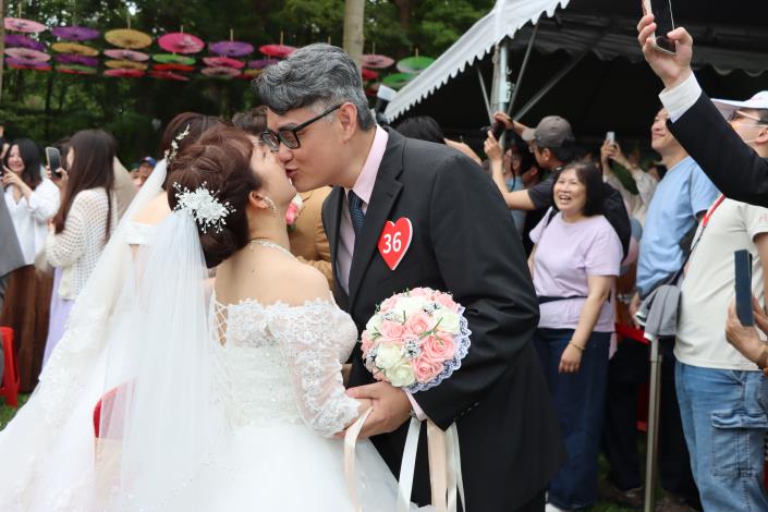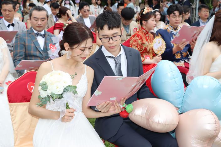 36對新人在浪漫樂聲中,宣讀結婚誓言,互戴戒指交換信物,最後深情擁吻,真情流露,在完婚儀式中,縣府秘書長陳斌山伉儷與來賓們戳破「2025桐花婚禮」的大氣球,裡面裝著的小氣球升空,此時新人們亦將彩帶拋向天空,象徵「幸福升空,甜蜜久久」,現場的親朋好友及遊客們皆報以熱烈掌聲同享喜悅。