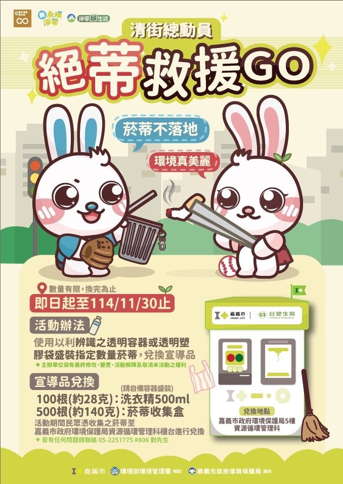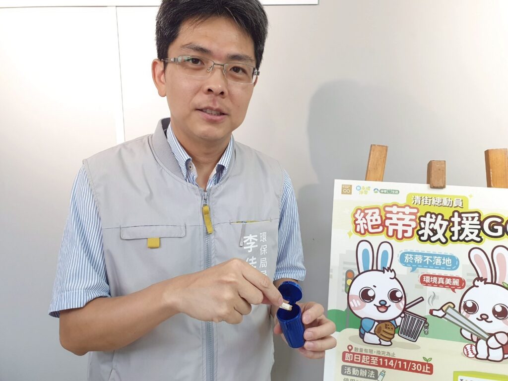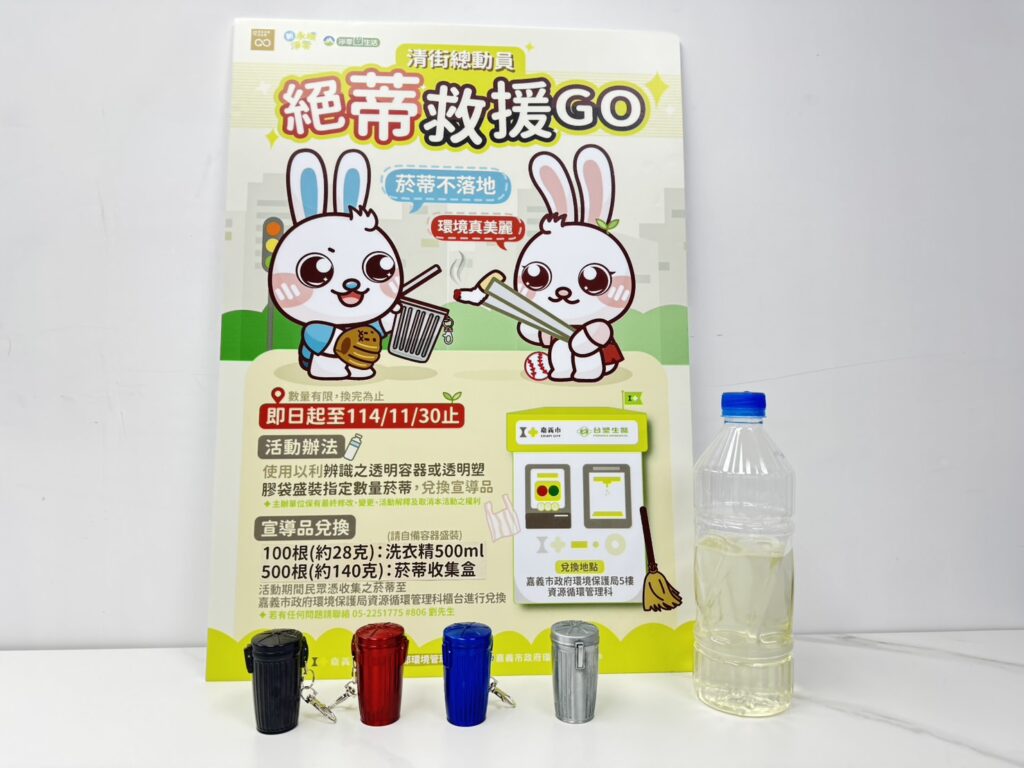 為了提升民眾環保意識及打造無菸蒂環境,嘉義市政府環境保護局推出「清街總動員 絕蒂救援GO」撿菸蒂換好禮活動,鼓勵民眾共同參與,活動期間(即日起至114年11月30日)民眾只要撿拾收集100根菸蒂即可兌換500mL環保洗衣精,收集500根菸蒂可兌換限量隨身菸蒂盒等實用禮物,活動詳情可至該局網站及臉書粉絲團了解。