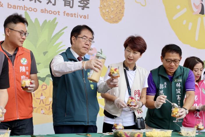 2025台南鳳梨好筍季於今(26)日在關廟山西宮創意登場,今(114)年以「關廟南菠旺」為主題,結合「夏季郊遊」之年輕化意象,並舉辦鳳筍PK賽,讓民眾更加了解農產特性與知識。今日活動由台南市長黃偉哲、立委王定宇、陳亭妃,市議員陳皇宇、吳禹寰、郭鴻儀、鄭佳欣等揭開序幕,現場並製作夏日消暑聖品-「鳳梨摩摩喳喳」與民眾共享,共同推薦來台南品嚐、選購新鮮美味、品質絕佳的關廟鳳梨與好筍,還可與家人朋友一同深入產區,享受一場夏季鳳梨輕旅行。