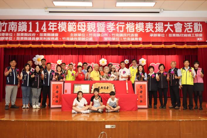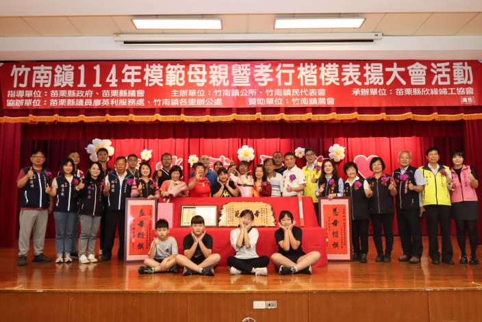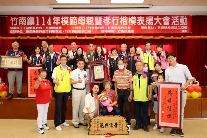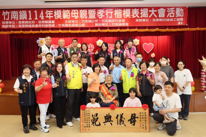 為慶祝母親節的到來,苗栗縣竹南鎮公所於5月4日上午在公所三樓演藝廳舉辦「114年度模範母親暨孝行楷模表揚大會」,共計表揚26位模範母親。苗栗縣長鍾東錦親自到場祝賀,並一一和獲獎者合影留念,預祝大家母親節快樂。