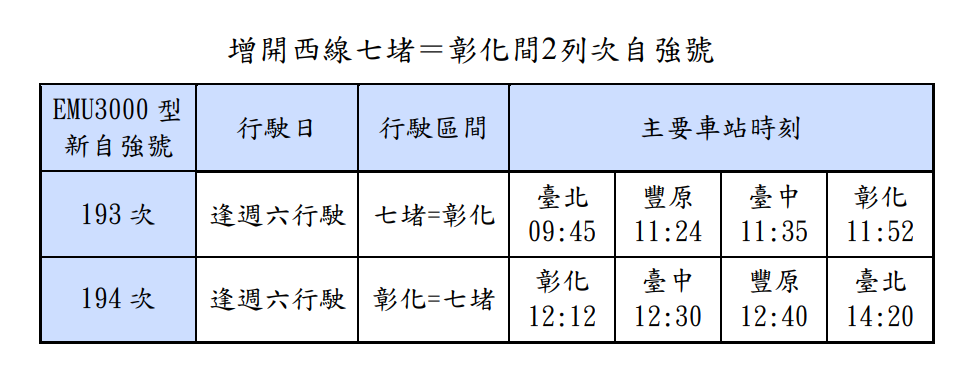 一、提升西線(臺北=臺中)直達車運能,逢週六七堵=彰化間增開2列次自強號。