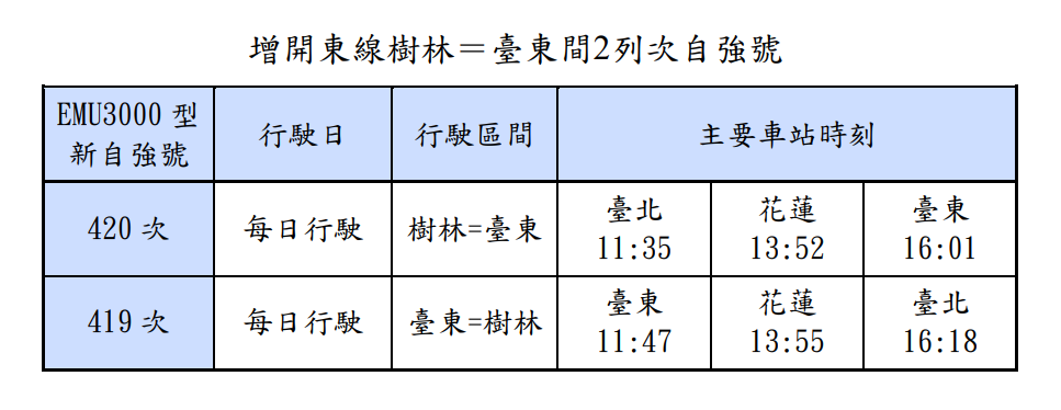二、增開東線(臺北=臺東)自強號班次,配合小清水溪橋改建工程完工,縮短臺北=花蓮間行駛時間,樹林=臺東間增開2列次自強號。