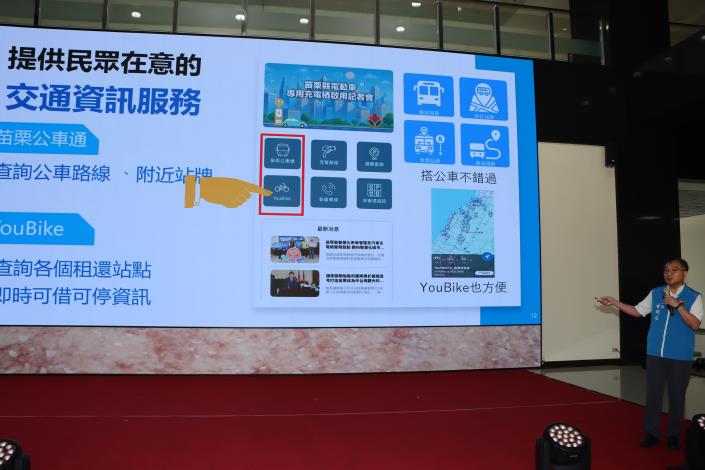 交通工務處處長古明弘表示,苗栗是六都以外率先啟用充電樁的縣市,本次有苗栗、竹南、頭份、通霄4個鄉鎮共42槍啟動試營運,5月底前會再增加公館、獅潭、後龍3個鄉鎮,提供民眾行的便利。另外本次同步啟用「苗栗通APP」,整合了微笑單車(YouBike)租借站、公車即時動態、觀光熱點的停車資訊、停車費繳納查詢等服務,讓所有交通相關資訊都能夠一鍵查詢,建設苗栗逐步成為智慧交通首要之都。