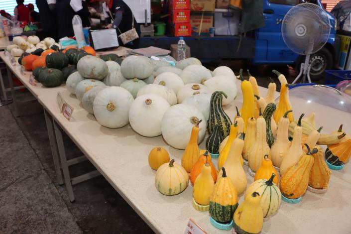 今年鄉農會購買各類南瓜種苗提供農民栽培的數量約2萬株,包括大南瓜800株、造型南瓜3000株、食用西洋南瓜15000株等,其中,大力推廣的西洋南瓜有東昇、瑞福、李白、一品、吉安等5種品種,傳統南瓜品種有阿成、金Q、牛奶南瓜等。