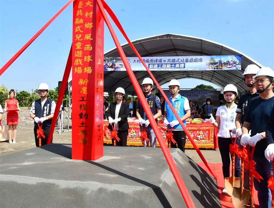 為提供大村鄉民優質的運動場所,由縣府補助1,000萬元、大村鄉公所自籌5,063萬元,總經費6,063萬元於大村鄉慈祥段80地號辦理「大村鄉風雨球場暨共融式兒童遊戲場興建工程」。今(13)日上午舉行動土儀式,彰化縣長王惠美、大村鄉長賴志銘等人與會。王縣長表示,這座園區是大村鄉親多年期盼的重要公共建設,未來將成為大村鄉首座兼具遮風避雨功能的風雨球場及共融式兒童遊戲場,園區佔地面積超過1.1萬平方公尺,包括風雨球場、滑輪溜冰場、共融式兒童遊戲場、體健設施與健行步道等,空間規劃融入在地特色與趣味設計,兼顧不同年齡與族群的使用需求,期望打造一座結合休憩、運動與教育功能的多元化場域,工期預計330日曆天,預計約115年4月完工。