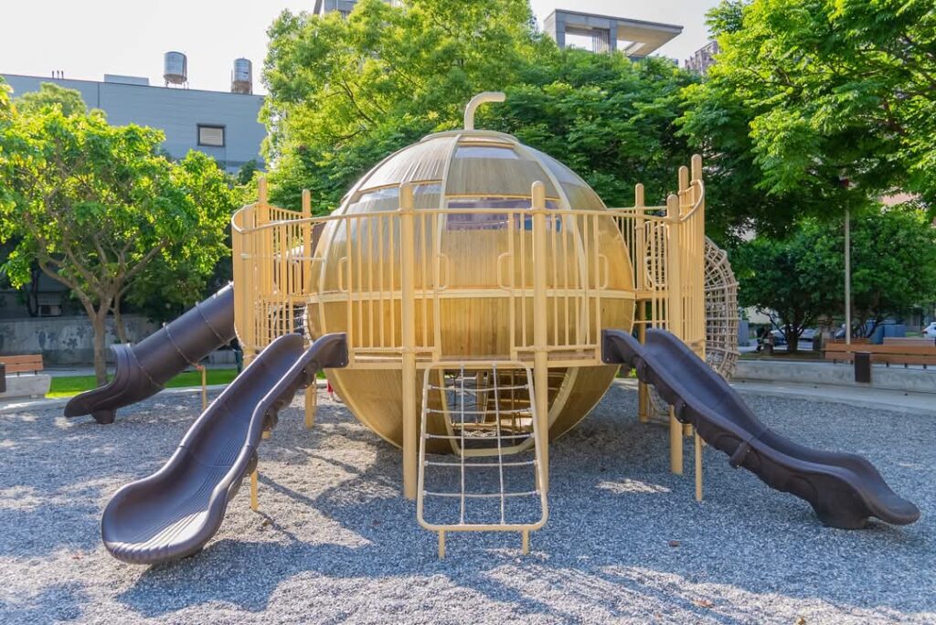 竹北市原本的蔬果公園,已經華麗變身為以「土星」為靈感的宇宙探險基地,沙黃色的遊具就像土星表面一樣神秘又吸睛。
