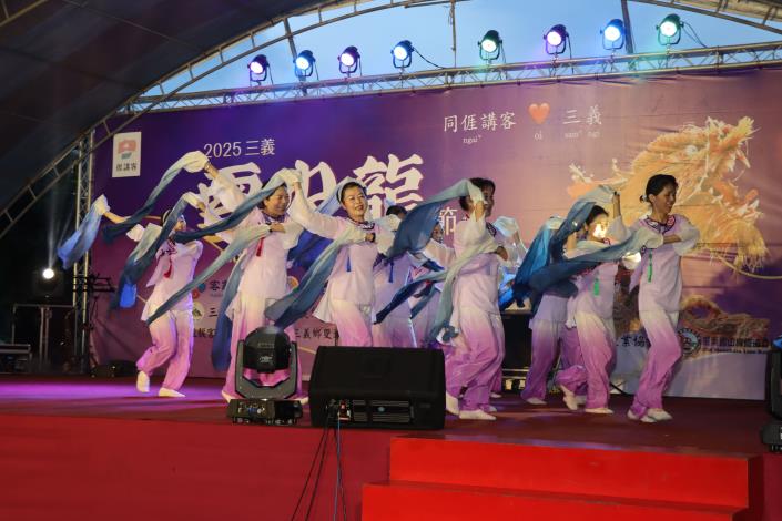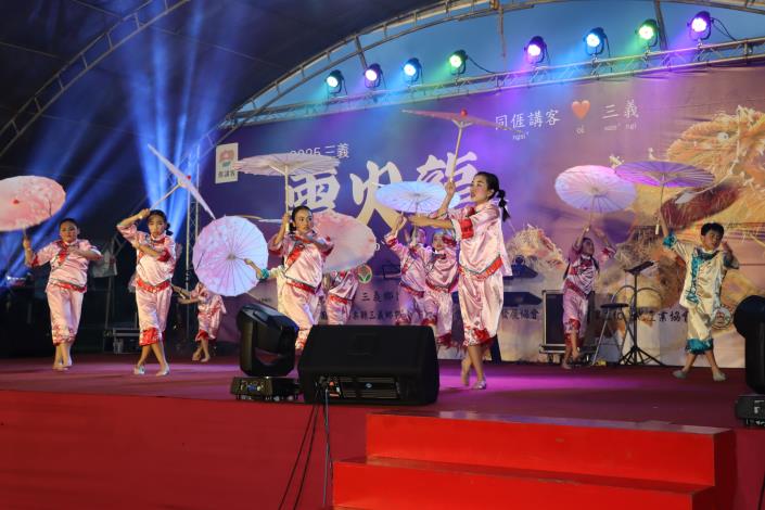 2025三義雲火龍節壓軸晚會5月17日晚間在三義河川加蓋廣場演出精彩的舞蹈、歌唱,並模彩助興,吸引大批民眾觀賞,縣長鍾東錦指出,三義鄉是苗栗縣雙慢城之1、木雕重鎮,雲火龍更是充滿地方文化特色的客庄節慶文化,歡迎全國遊客每年在初夏時節都能夠共下來「龍」躍三義,體驗客庄傳統民俗活動魅力。