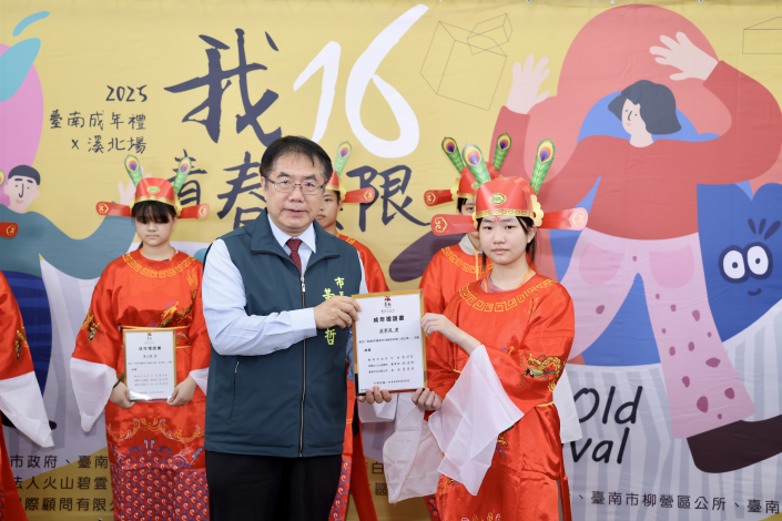 黃偉哲強調,現今依規定雖是18歲才是法律意義上的成年,但16歲的青少年們,卻也承載了家人社會的期待及自我期許,因此16歲的成年禮,不僅傳承了民間的習俗,更有其時代意義,希望大家一起更重視青少年。