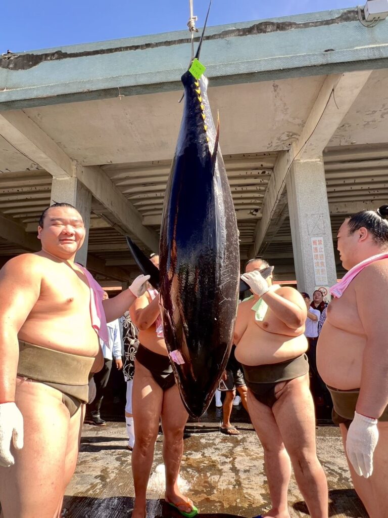 適逢屏東黑鮪魚文化觀光季,東港魚市場今(9)日迎來一群重量級貴賓─來自日本的錣山部屋力士們,在屏東縣政府邀請下,一起挑戰「扛起黑鮪魚試煉」,壯碩的力士們奮力嘗試將大尾黑鮪魚扛起,然而黑鮪魚體型龐大、油脂豐富滑如抹油,沒有扛魚經驗的他們根本難以掌握,讓力士們驚呼連連,直呼:「完全顛覆對魚的想像!」,為早晨魚市帶來熱鬧氣氛。
